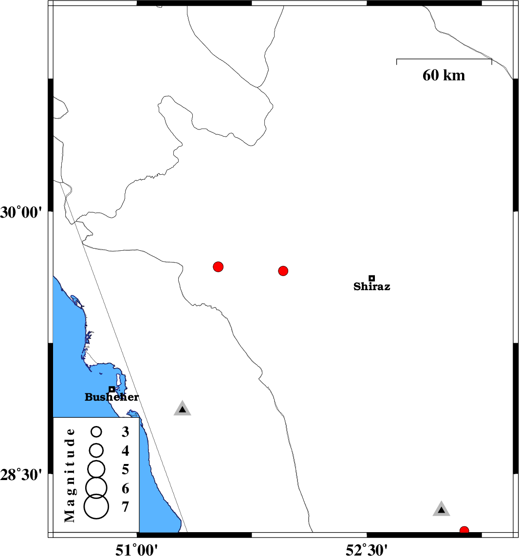 | 2017/02/02 | 07:51:49.0 | 11:21:49.0 | 29.684 | 51.531 | 15 | ML:3 | Fars Province, 14 km -West of Kazerun |