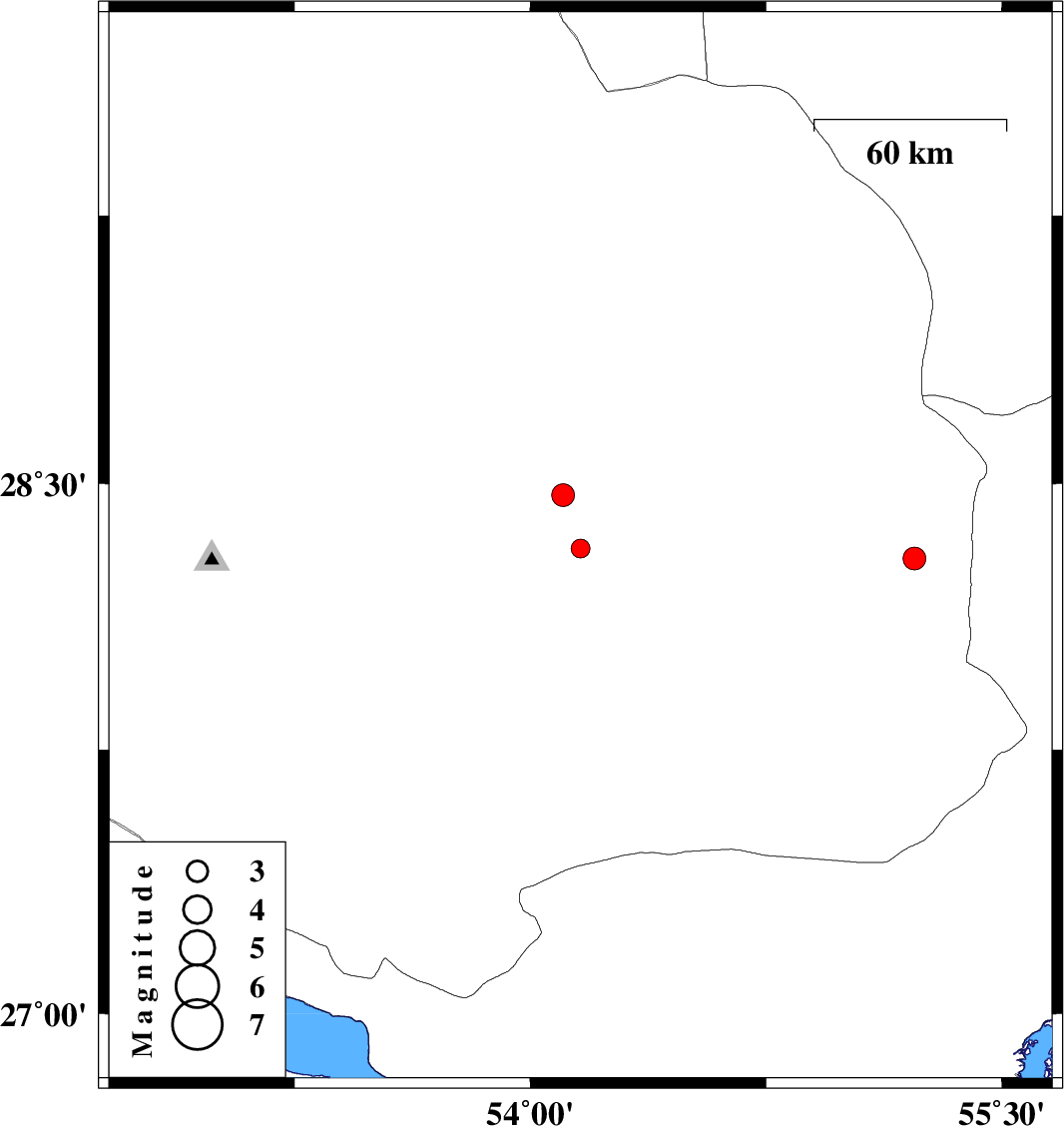 | 2017/02/09 | 02:06:11.6 | 05:36:11.6 | 27.179 | 53.058 | 14 | ML:2.8 | Hormozgan Province, 20 km South-West of Lamerd |