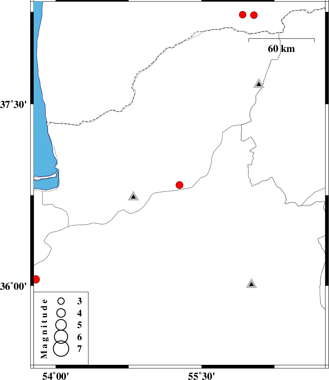 | 2017/02/13 | 02:27:10.1 | 05:57:10.1 | 36.835 | 55.273 | 9 | ML:3.4 | Golestan Province, 23 km South-East of Ramian | ||