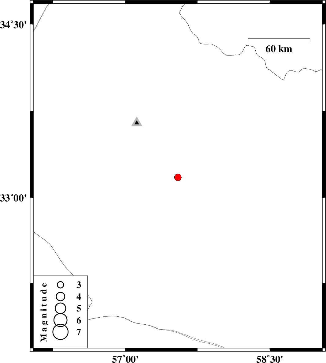 | 2017/02/13 | 12:55:51.6 | 16:25:51.6 | 33.177 | 57.546 | 15 | ML:3.3 | Yazd Province, 74 km South-East of Tabas | ||
