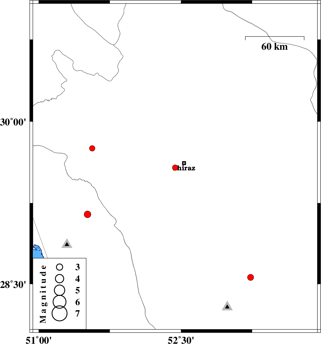 | 2017/03/02 | 22:23:13.3 | 01:53:13.3 | 29.577 | 52.438 | 14 | ML:2.7 | Fars Province, 10 km of Shiraz | ||