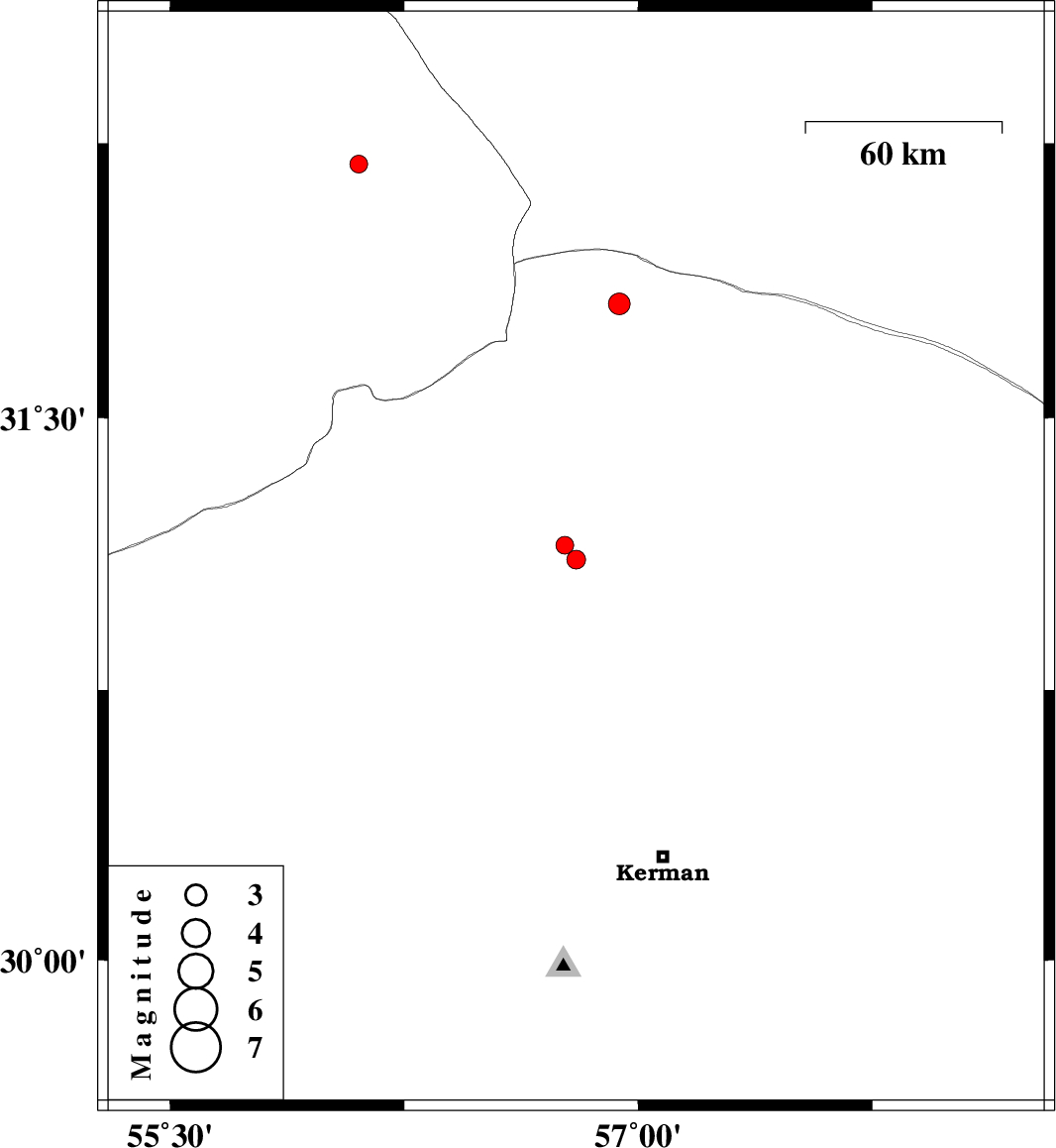 | 2017/03/04 | 19:36:56.2 | 23:06:56.2 | 31.149 | 56.765 | 14 | ML:2.5 | Kerman Province, 14 km South of Ravar | ||