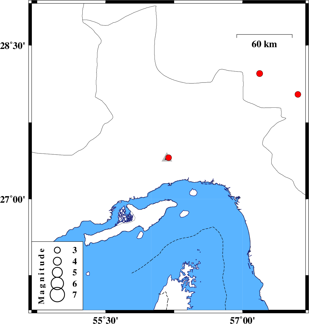 | 2017/03/08 | 05:00:11.1 | 08:30:11.1 | 28.227 | 57.187 | 16 | ML:3.1 | Kerman Province, 59 km North-West of Kahnuj |