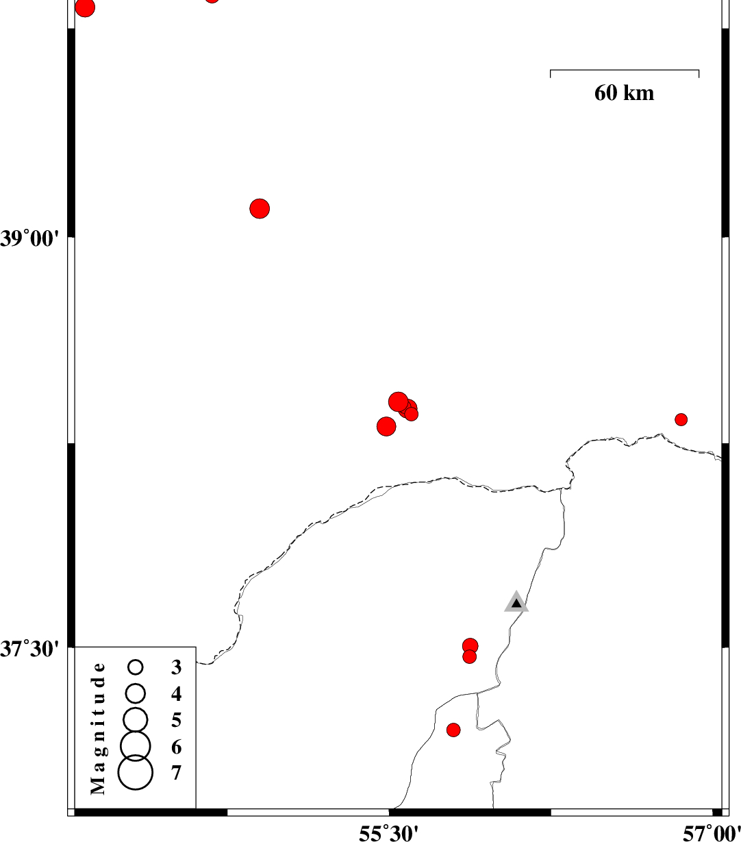 | 2017/02/22 | 10:54:06.3 | 14:24:06.3 | 39.103 | 54.9 | 14 | ML:4.1 | Turkmenistan |