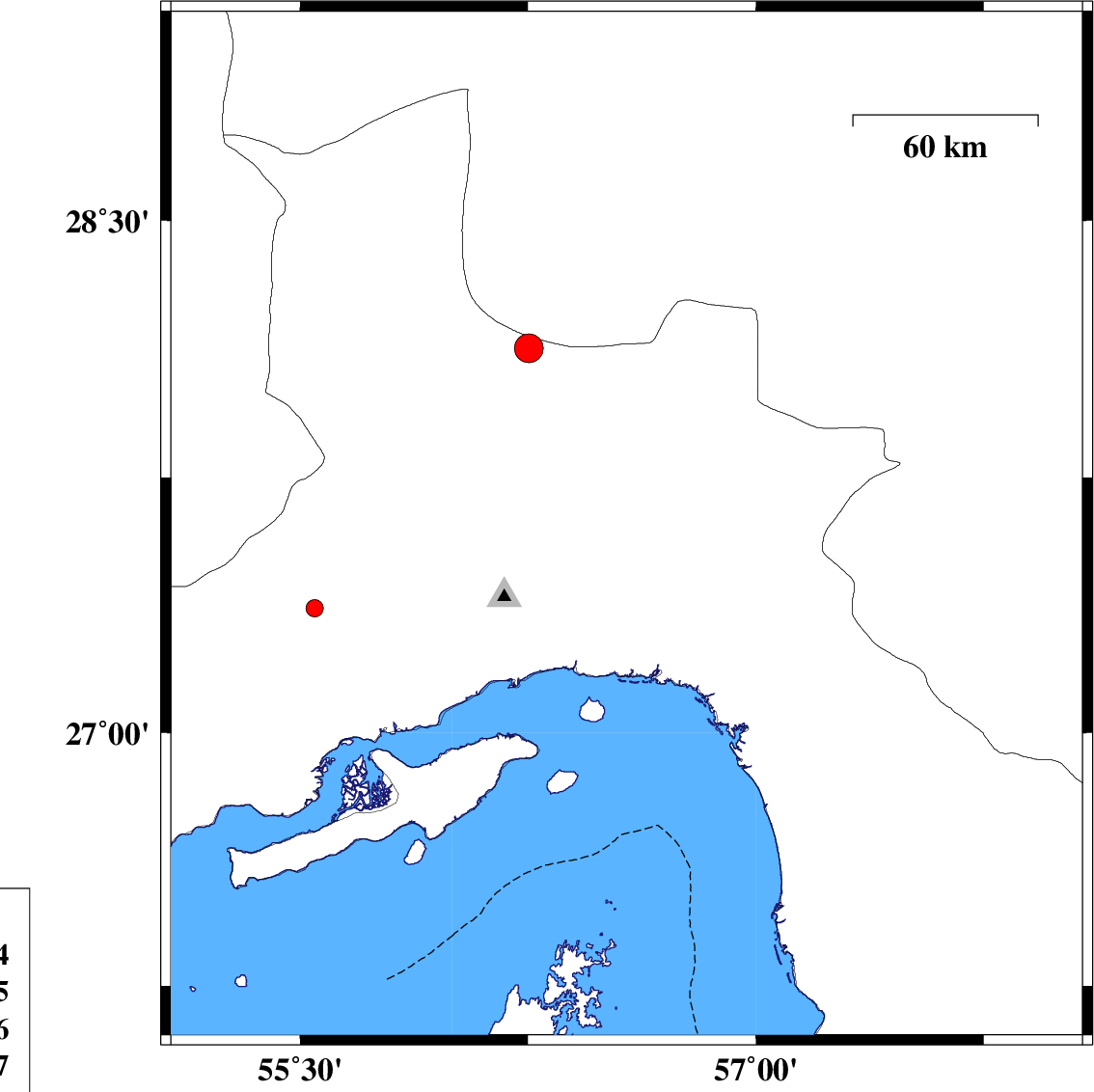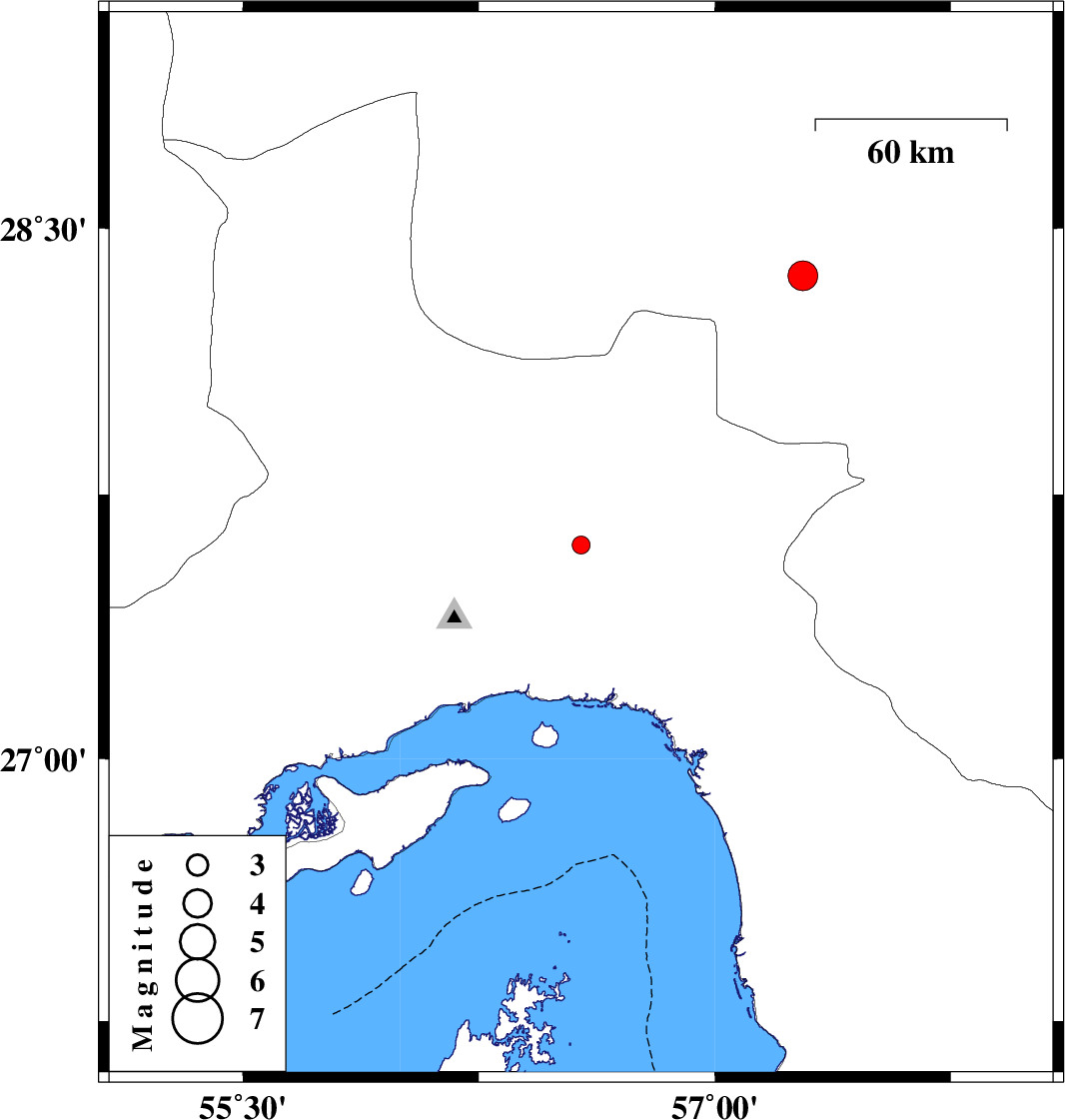 | 2017/03/30 | 04:36:10.1 | 09:06:10.1 | 27.606 | 56.575 | 14 | ML:2.6 | Hormozgan Province, 55 km North-East of Bandar-e abbas | ||