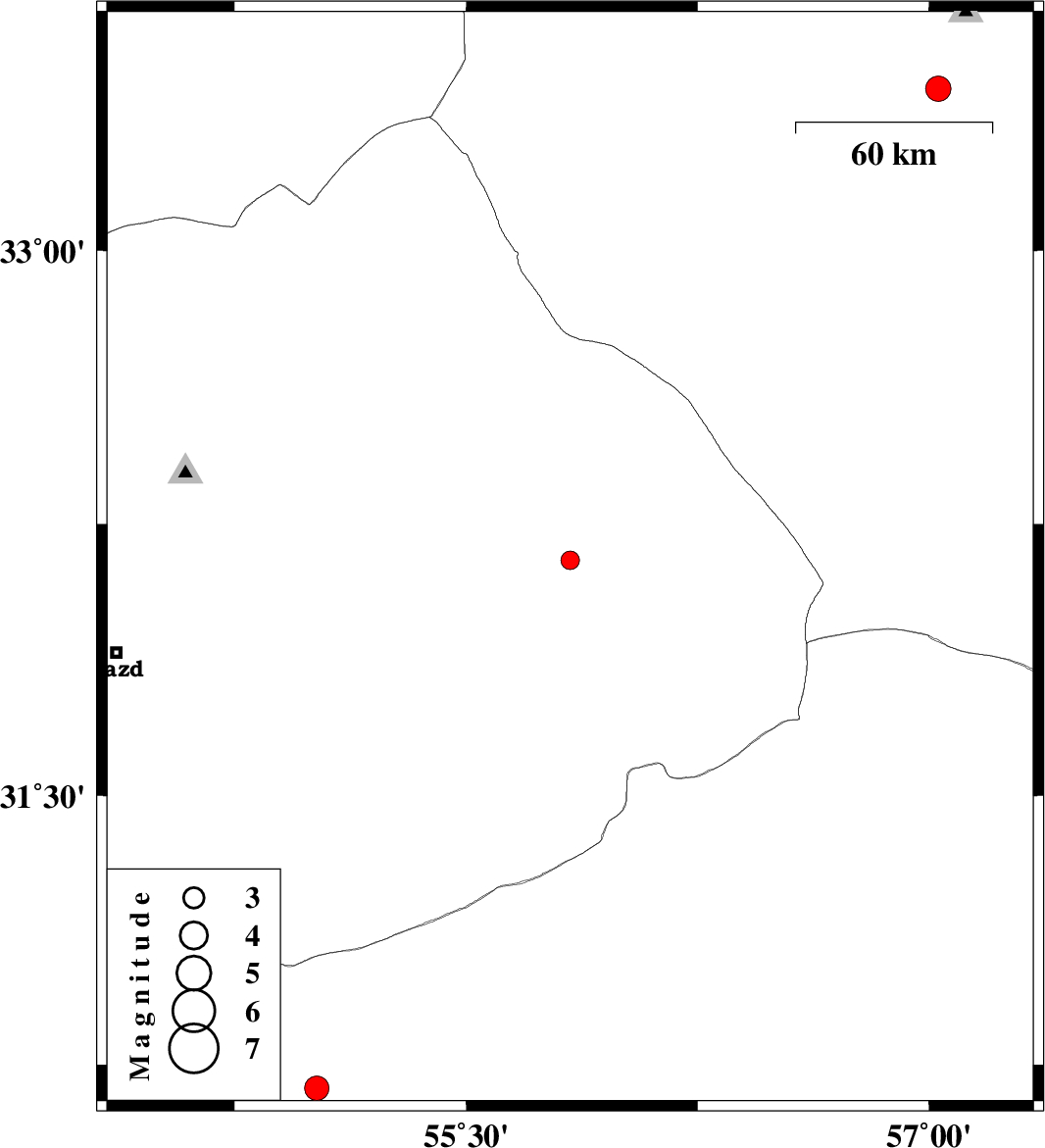 | 2017/04/08 | 10:46:05.3 | 15:16:05.3 | 33.44 | 57.029 | 8 | ML:3.6 | Yazd Province, 20 km South-East of Tabas | ||