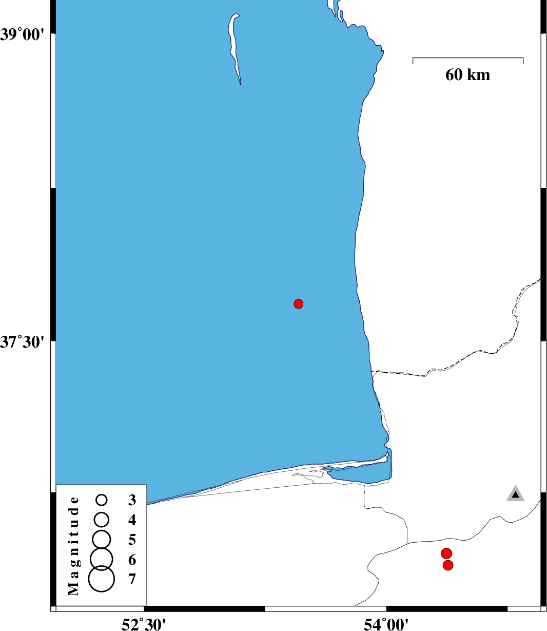 | 2017/04/14 | 21:14:32.9 | 01:44:32.9 | 37.682 | 53.456 | 15 | ML:2.5 | Caspian Sea | ||