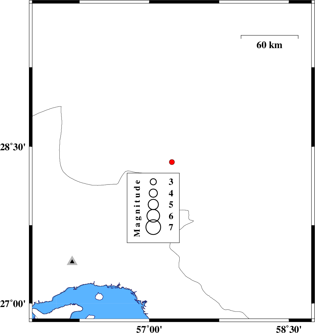 | 2017/04/09 | 17:41:24.2 | 22:11:24.2 | 28.064 | 57.269 | 18 | ML:2.9 | Kerman Province, 44 km North-West of Kahnuj |