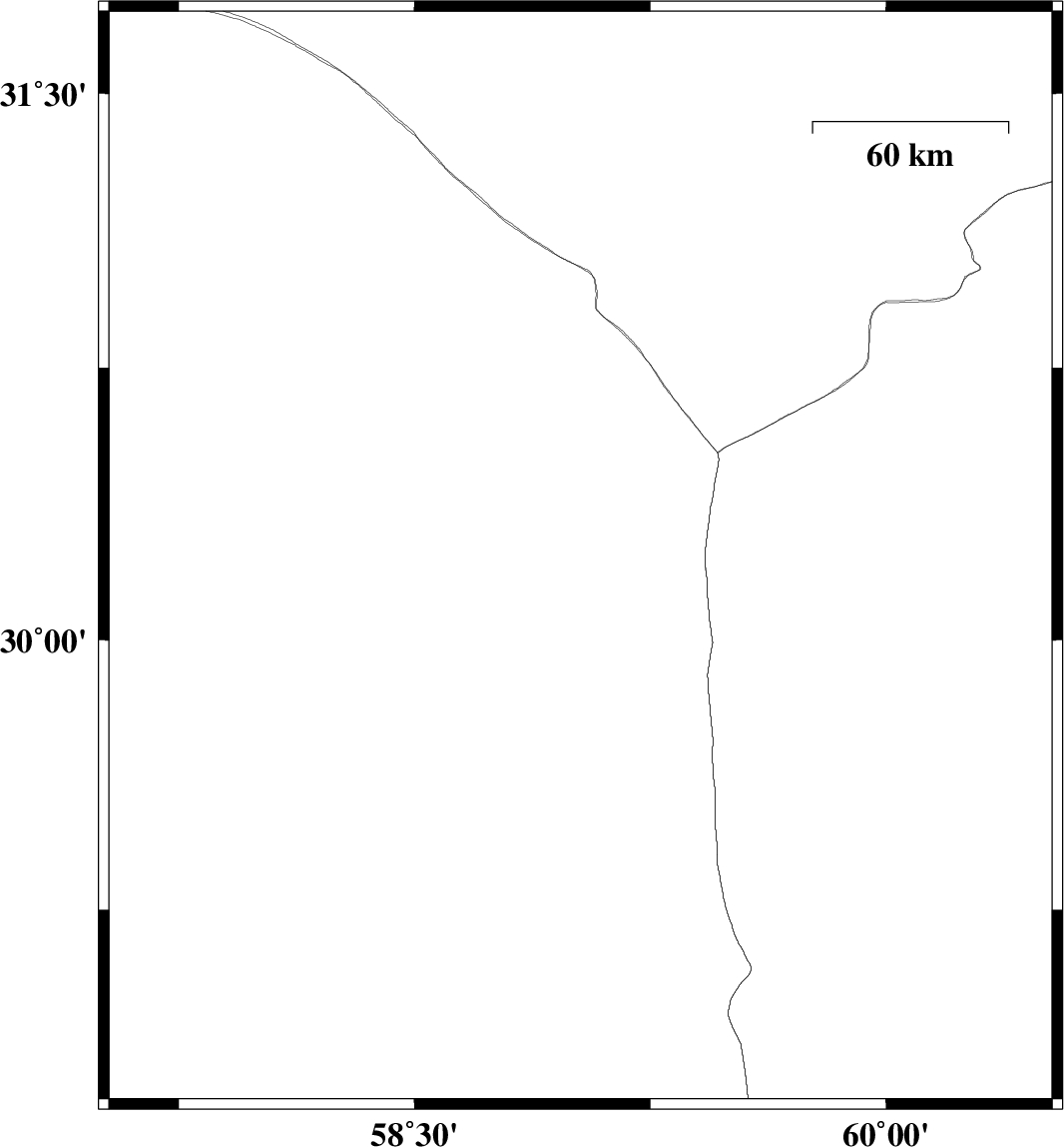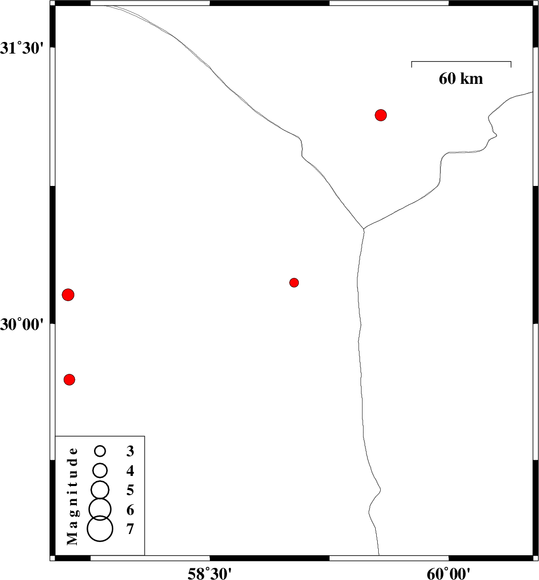 | 2017/04/25 | 23:52:20.9 | 04:22:20.9 | 30.223 | 59.028 | 14 | ML:2.5 | Kerman Province, 140 km North-East of Bam | ||
