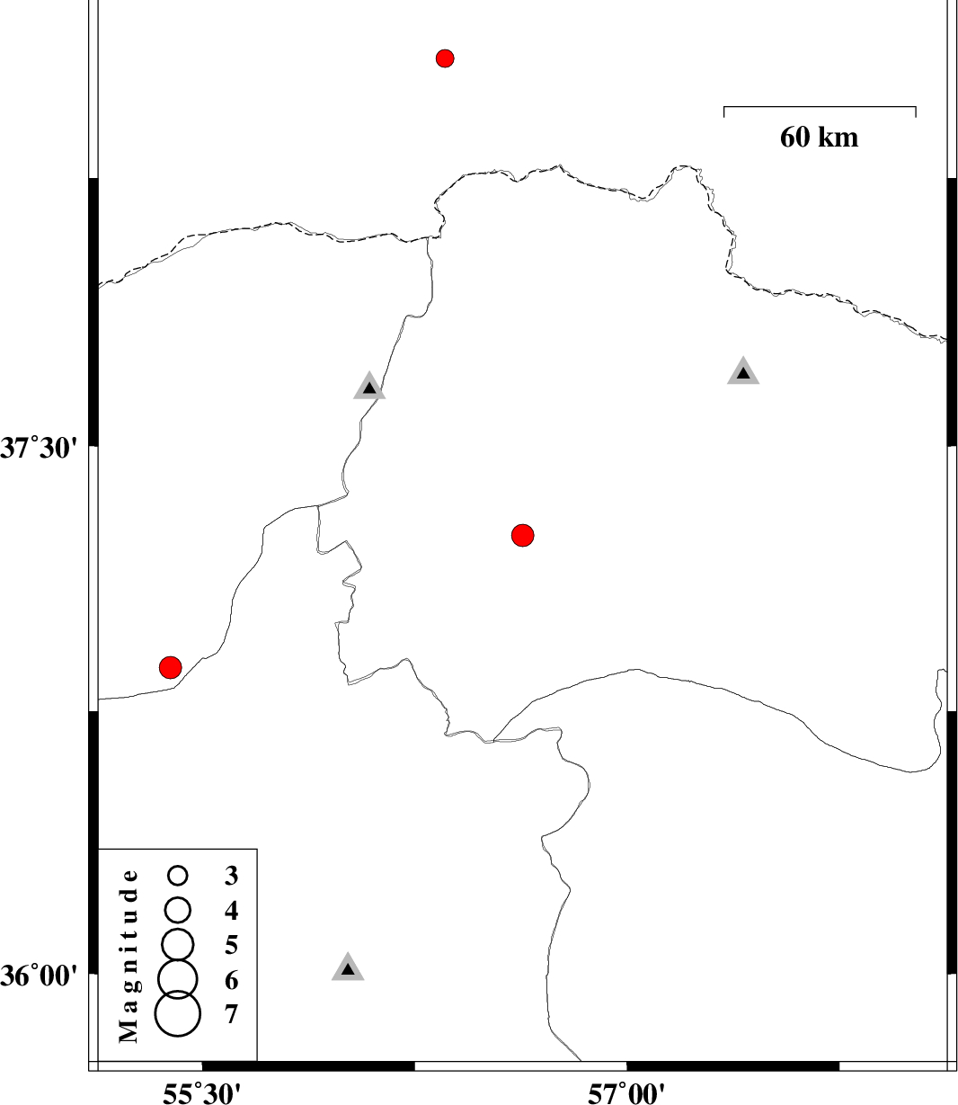 | 2017/04/24 | 15:18:16.8 | 19:48:16.8 | 37.248 | 56.631 | 15 | ML:3.5 | Khorasan(north) Province, 39 km North-East of Jajarm | ||