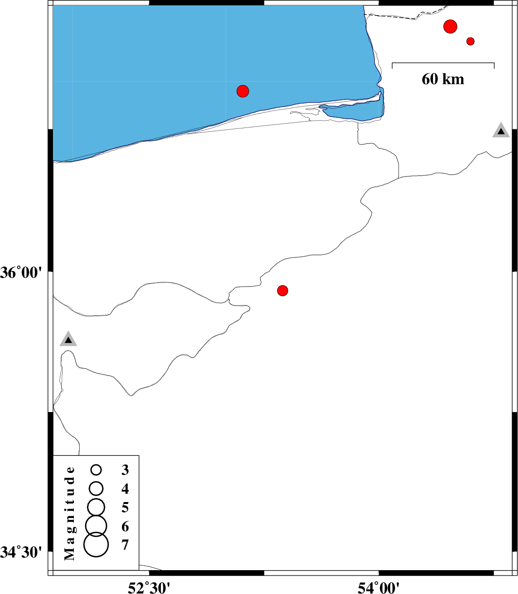 | 2017/04/24 | 11:09:12.2 | 15:39:12.2 | 36.95 | 53.111 | 14 | ML:3.5 | Caspian Sea, 44 km North of Sari | ||