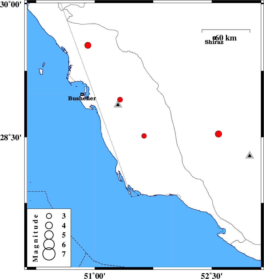| 2017/04/26 | 10:28:27.3 | 14:58:27.3 | 29.538 | 50.912 | 18 | ML:3.6 | Bushehr Province, 39 km -East of Bandar-e genaveh | ||