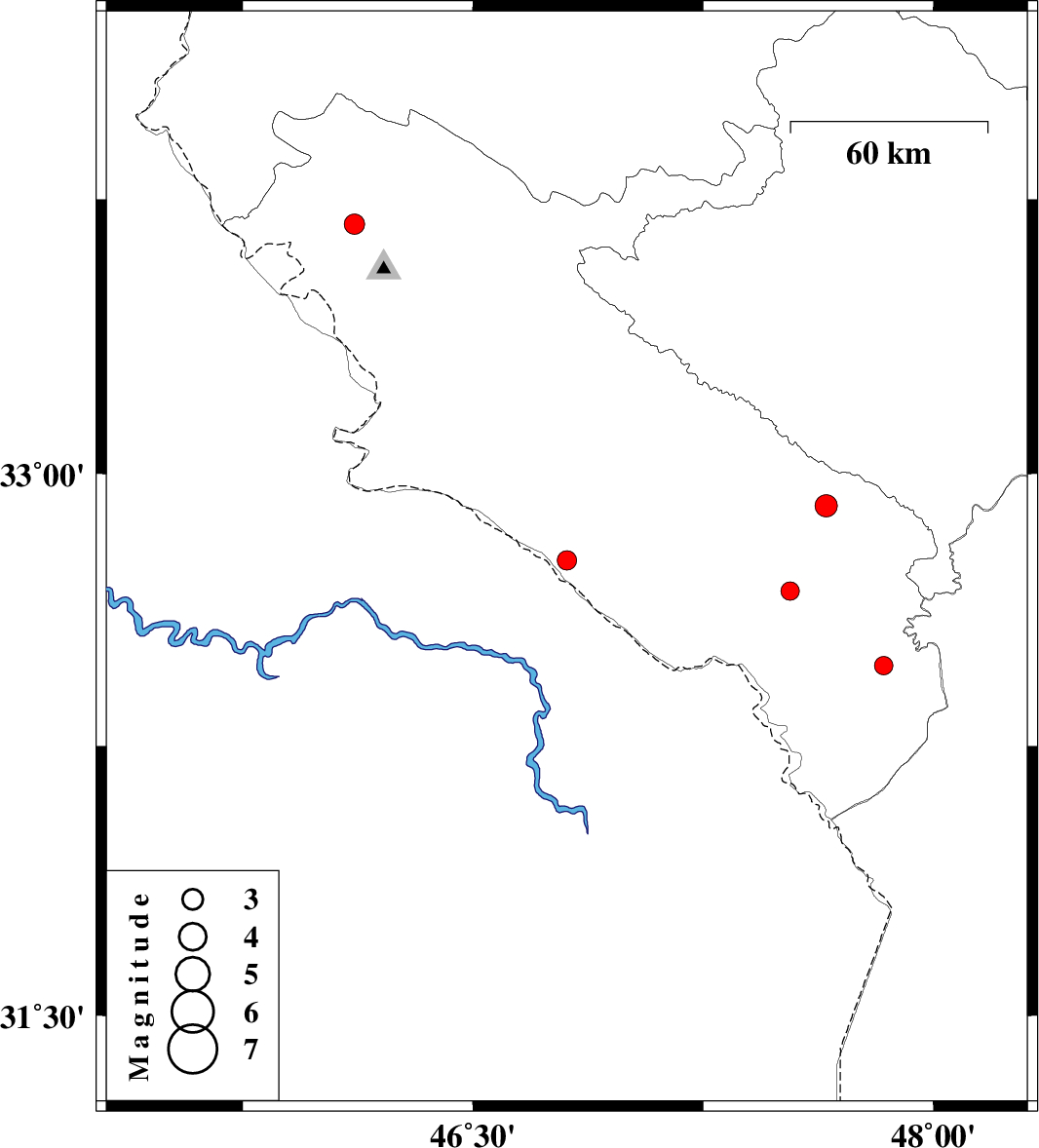 | 2017/04/21 | 17:32:43.4 | 22:02:43.4 | 32.678 | 47.534 | 14 | ML:2.7 | Ilam Province, 26 km -East of Dehloran | ||
