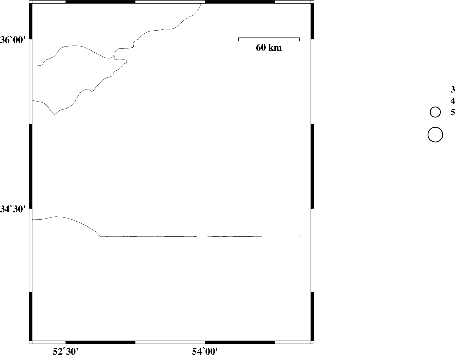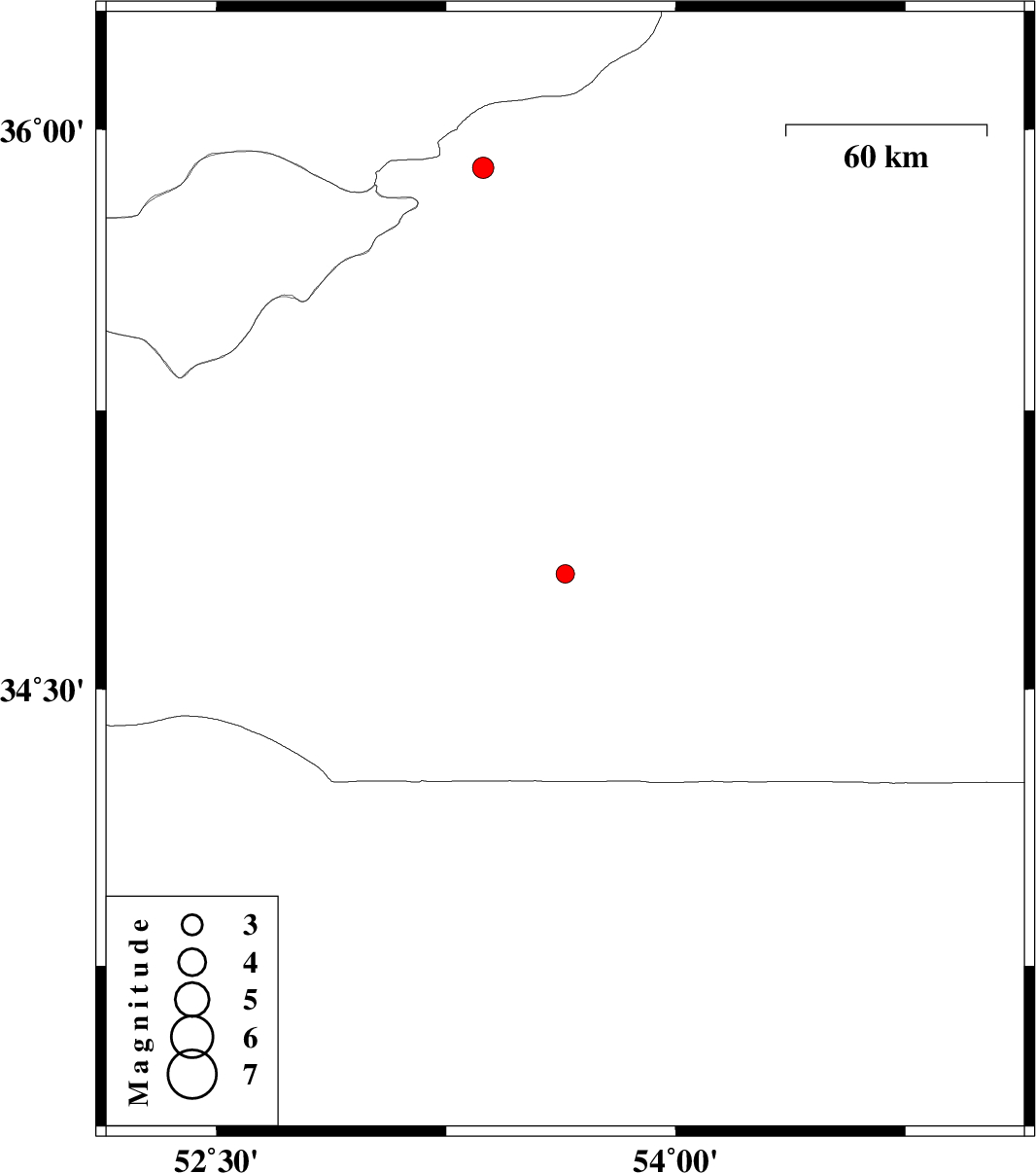| 2017/05/22 | 09:18:40.2 | 13:48:40.2 | 34.812 | 53.639 | 16 | ML:2.7 | Semnan Province, 87 km South-East of Semnan | ||