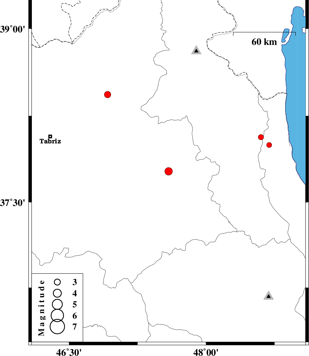 | 2017/05/29 | 03:00:13.3 | 07:30:13.3 | 37.77 | 47.59 | 15 | ML:3.8 | Azarbaijan Sharghi Province, 19 km South of Sarab | ||