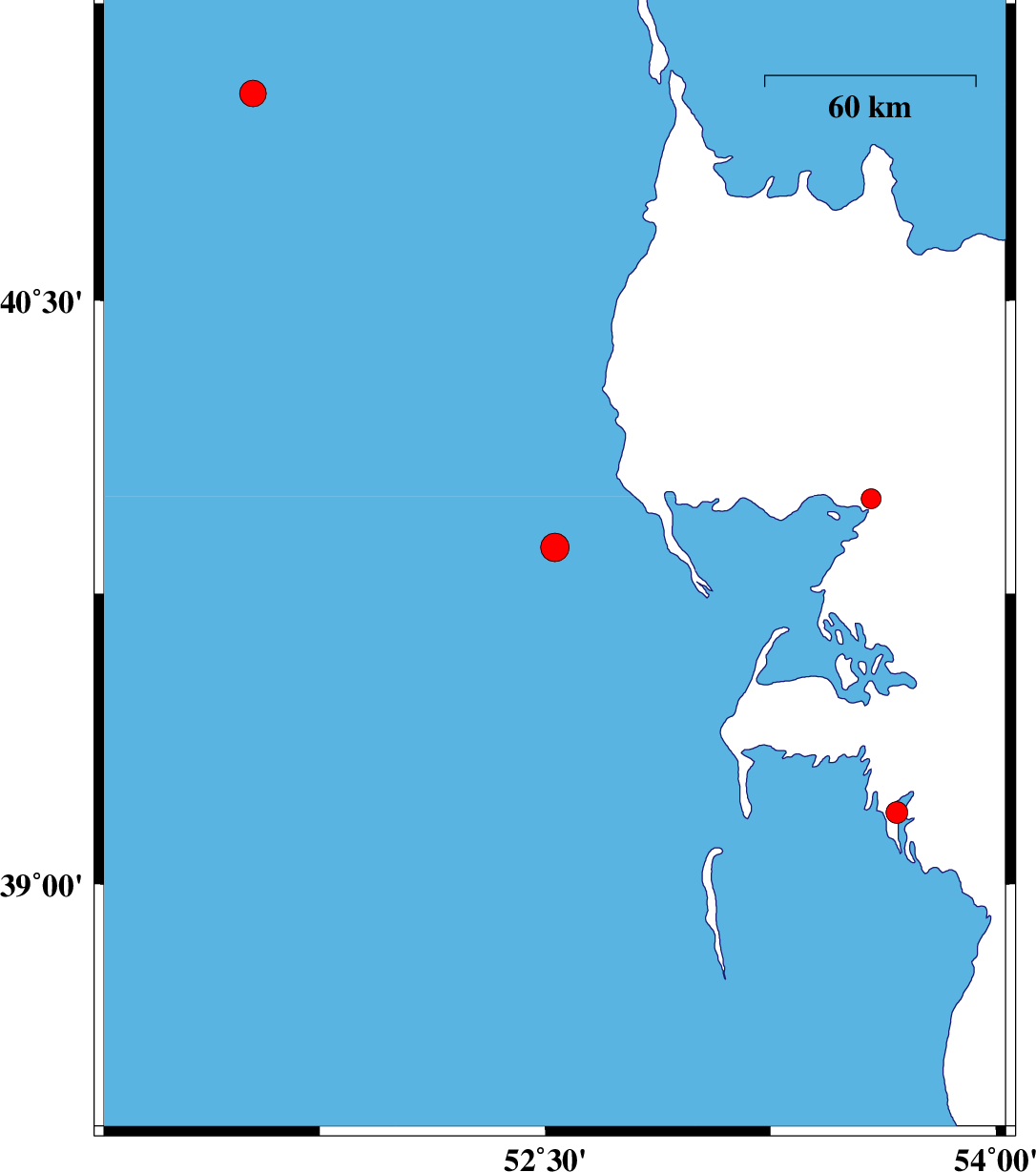 2017/05/30 | 13:33:15.1 | 18:03:15.1 | 41.024 | 51.527 | 15 | ML:4 | Caspian Sea |