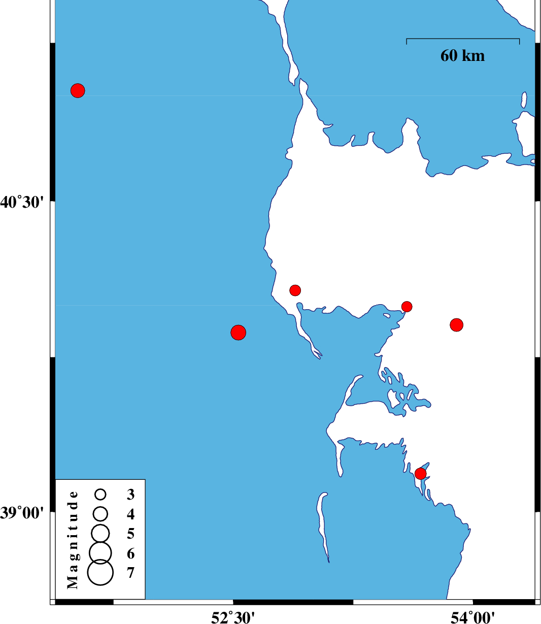 2017/05/30 | 13:33:15.1 | 18:03:15.1 | 41.024 | 51.527 | 15 | ML:4 | Caspian Sea |