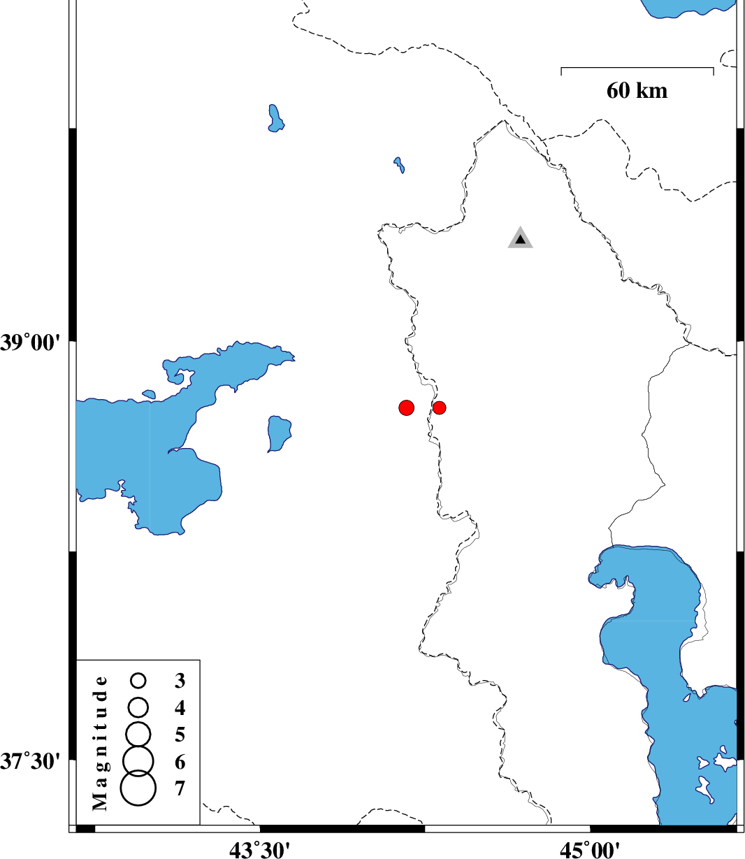 | 2017/06/14 | 04:20:13.3 | 08:50:13.3 | 38.763 | 44.165 | 14 | ML:3.1 | Turkey, 40 km South-West of Seyah Cheshmah | ||