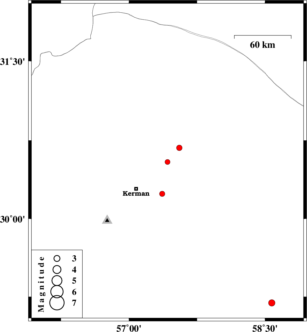 | 2017/06/09 | 15:05:58.7 | 19:35:58.7 | 30.678 | 57.555 | 14 | ML:2.8 | Kerman Province, 63 km North-East of Kerman |