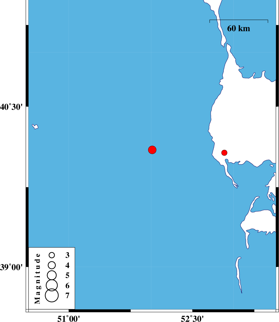 2017/06/20 | 12:05:28.5 | 16:35:28.5 | 40.098 | 52.012 | 15 | ML:4.4 | Caspian Sea, 82 km -West of Turkmenbasi | ||
