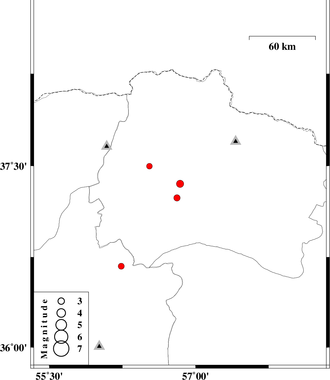 2017/06/28 | 11:19:30.4 | 15:49:30.4 | 37.237 | 56.81 | 6 | ML:2.9 | Khorasan(north) Province, 37 km South-West of Ashkhaneh | ||