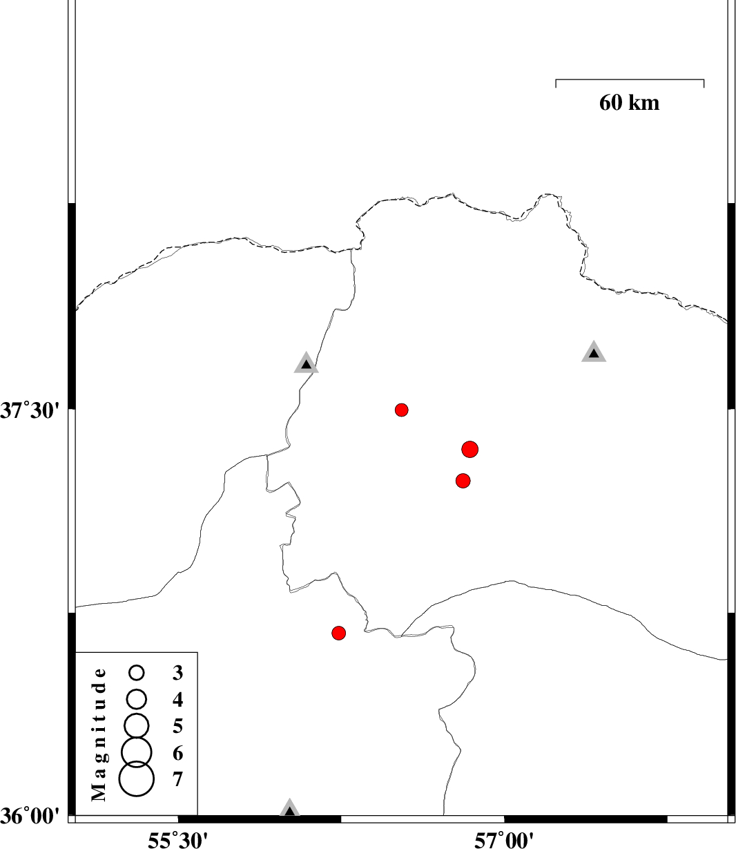 2017/06/28 | 11:19:30.4 | 15:49:30.4 | 37.237 | 56.81 | 6 | ML:2.9 | Khorasan(north) Province, 37 km South-West of Ashkhaneh | ||