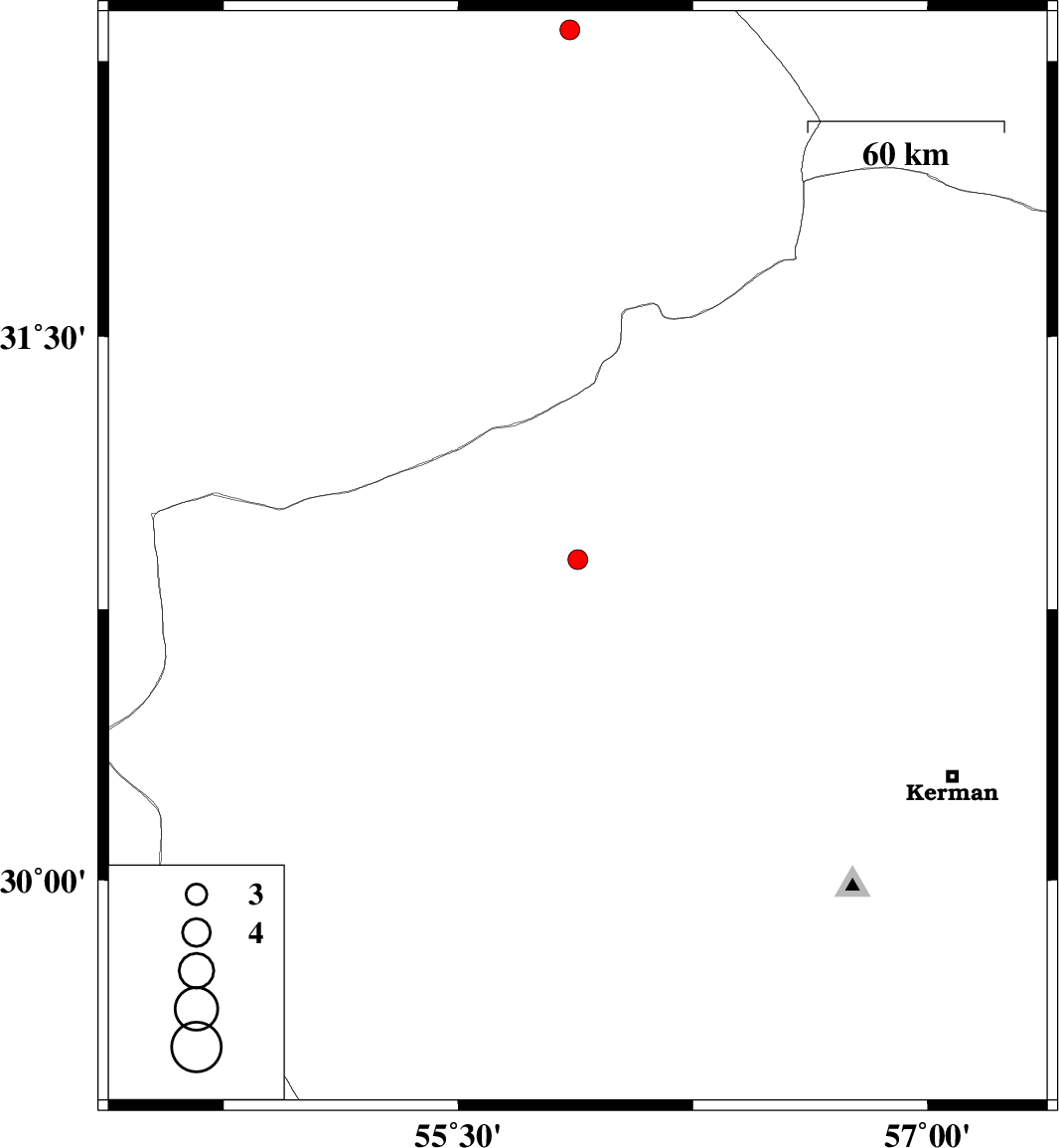 | 2017/06/30 | 14:10:52.9 | 18:40:52.9 | 30.887 | 55.882 | 14 | ML:2.8 | Kerman Province, 55 km North-West of Rafsanjan | ||