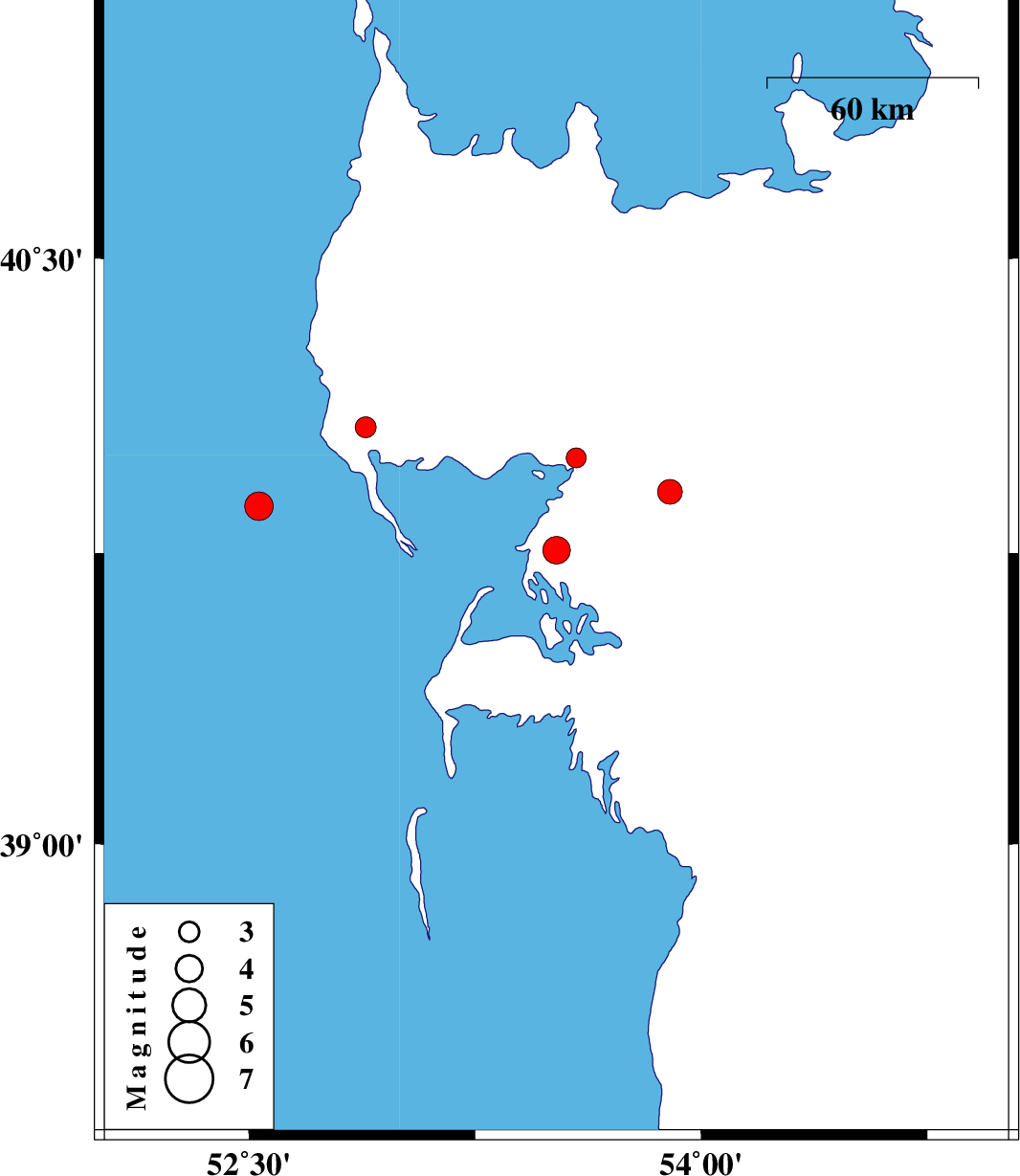 2017/06/07 | 10:17:27.3 | 14:47:27.3 | 39.869 | 52.532 | 15 | ML:4.3 | Caspian Sea, 41 km South-West of Turkmenbasi | ||