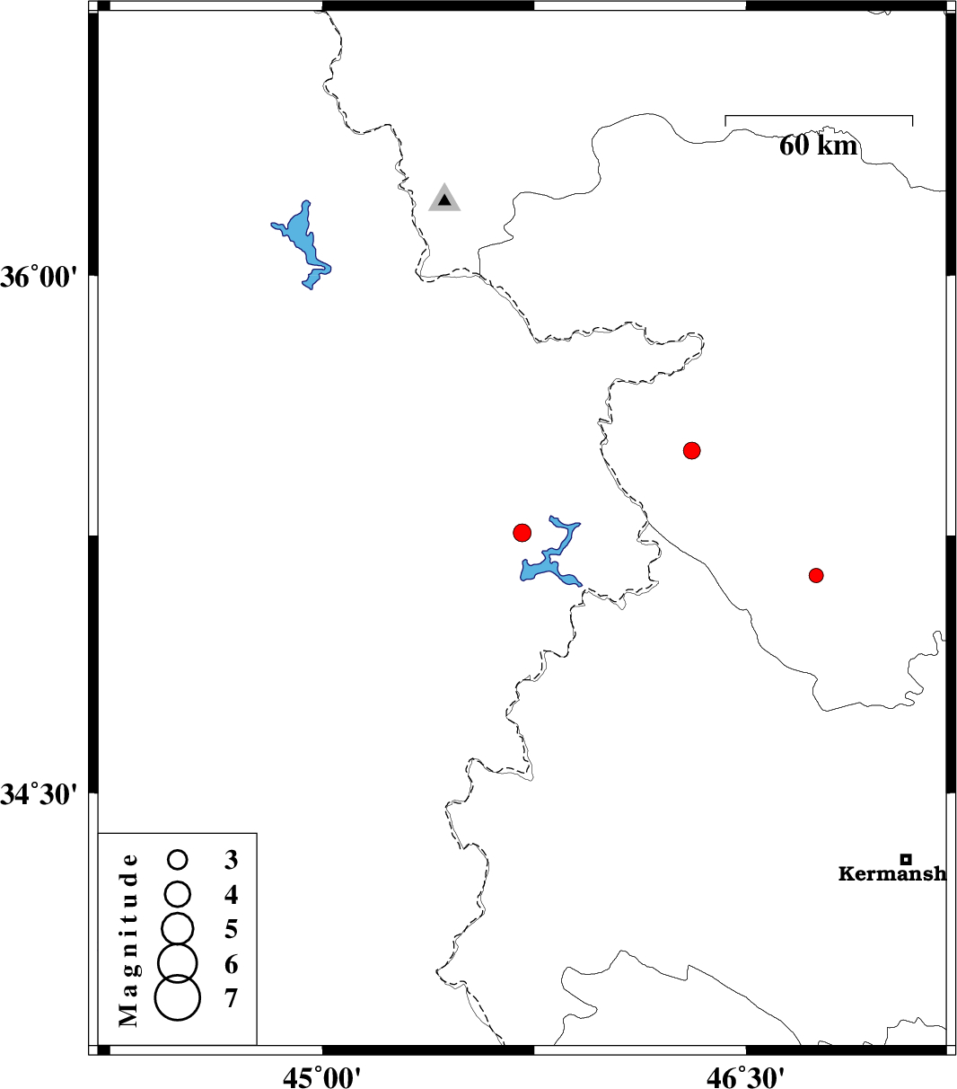 | 2017/06/19 | 01:47:46.1 | 06:17:46.1 | 35.133 | 46.747 | 7 | ML:2.2 | Kurdistan Province, 31 km South-West of Sanandaj |