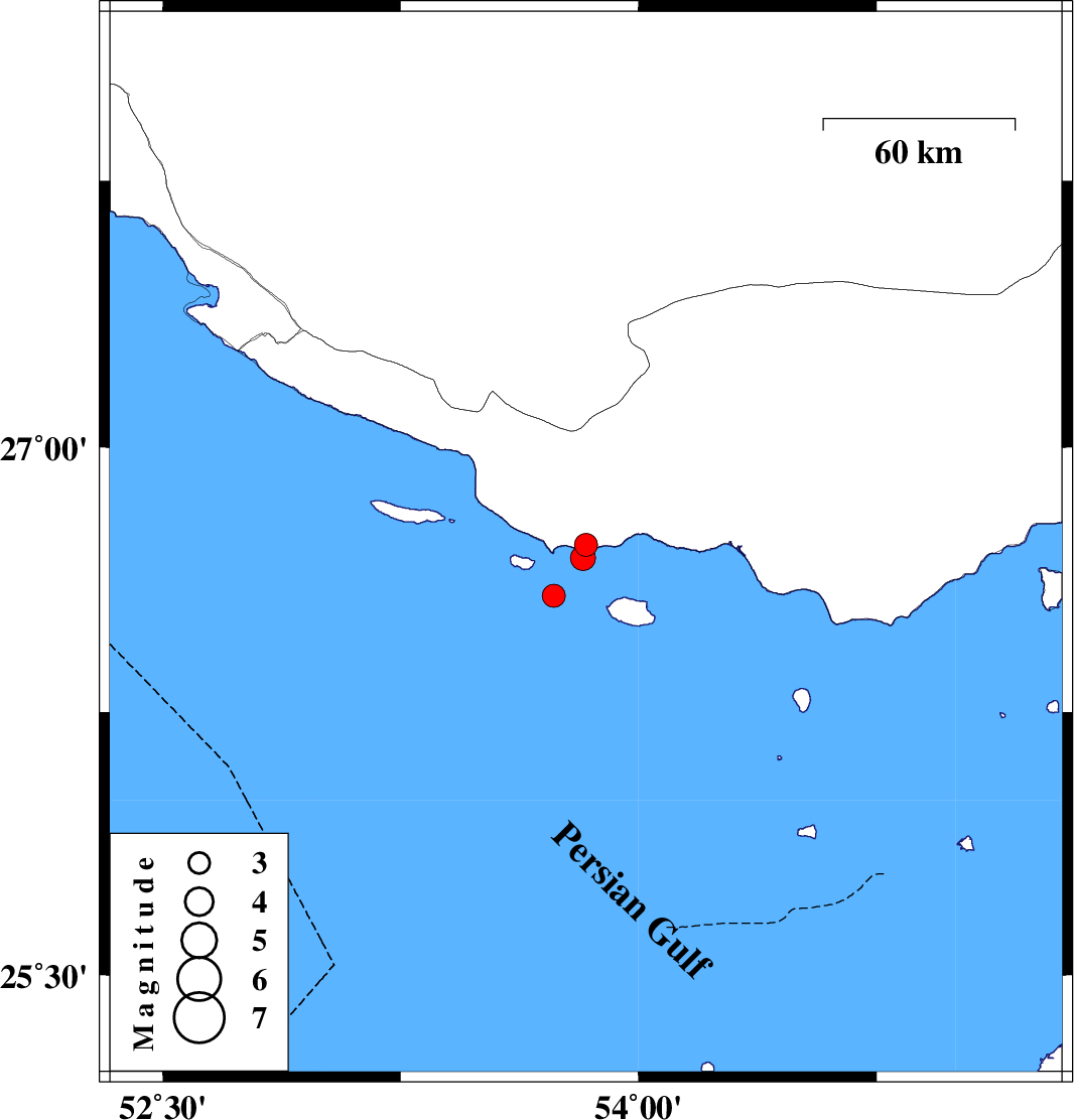 | 2017/06/29 | 04:35:54.1 | 09:05:54.1 | 26.581 | 53.732 | 14 | ML:3.3 | Persian Gulf |