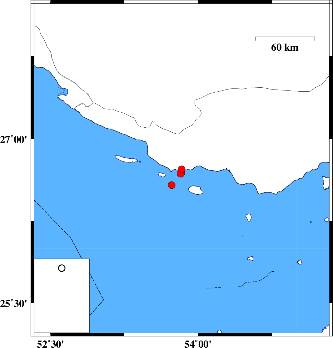 | 2017/07/02 | 06:19:50.3 | 10:49:50.3 | 26.688 | 53.824 | 14 | ML:3.5 | Persian Gulf, 78 km South-West of Bastak | ||