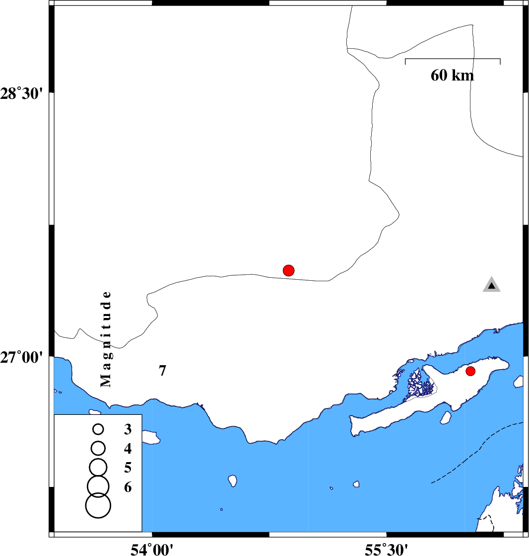 | 2017/07/19 | 22:06:43.5 | 02:36:43.5 | 26.914 | 56.037 | 12 | ML:2.7 | Persian Gulf, 23 km -West of Qeshm |