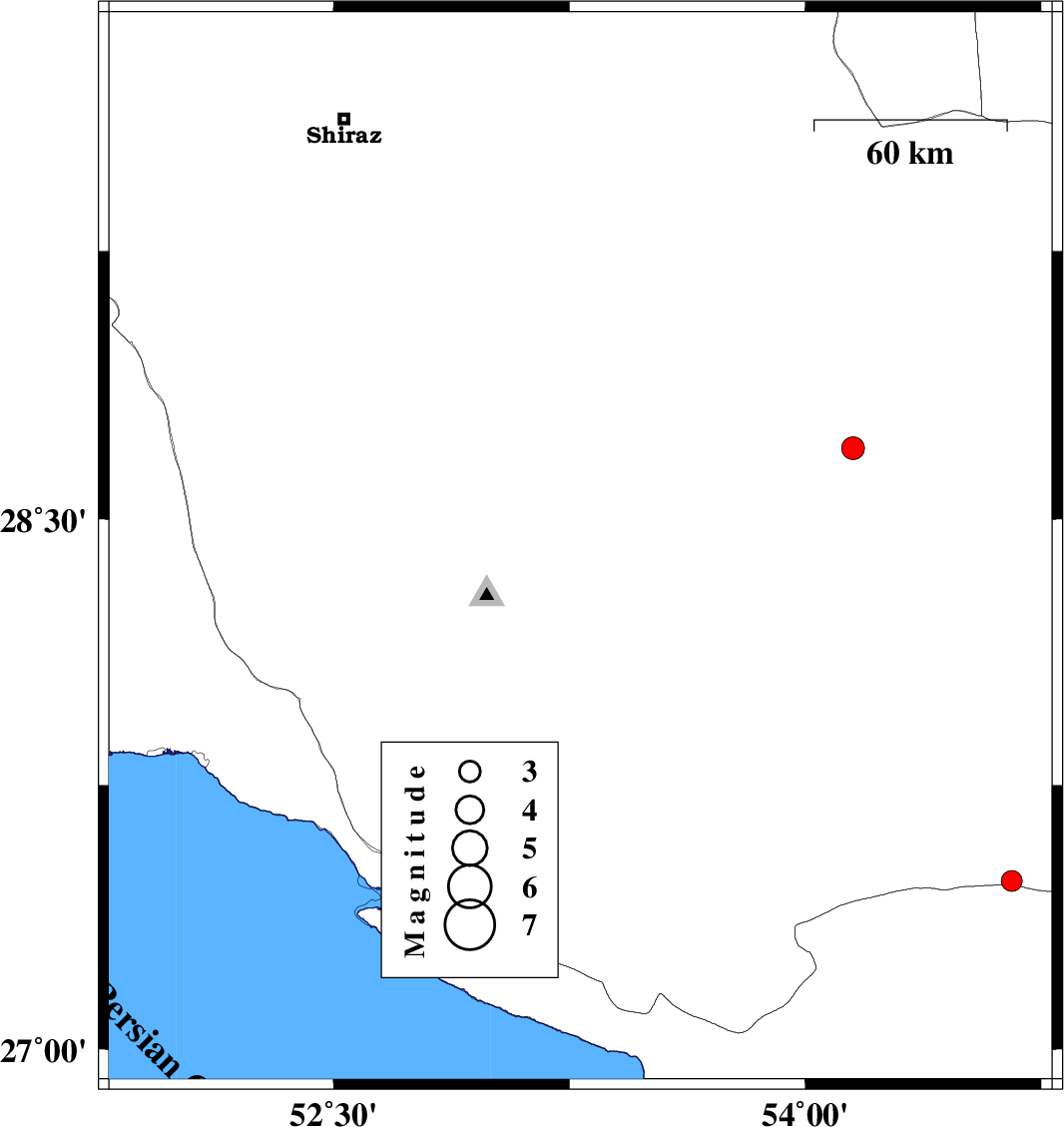 | 2017/07/27 | 02:50:43.6 | 07:20:43.6 | 28.416 | 53.285 | 6 | ML:3.2 | Fars Province, 25 km -East of Qir va Karzin | ||