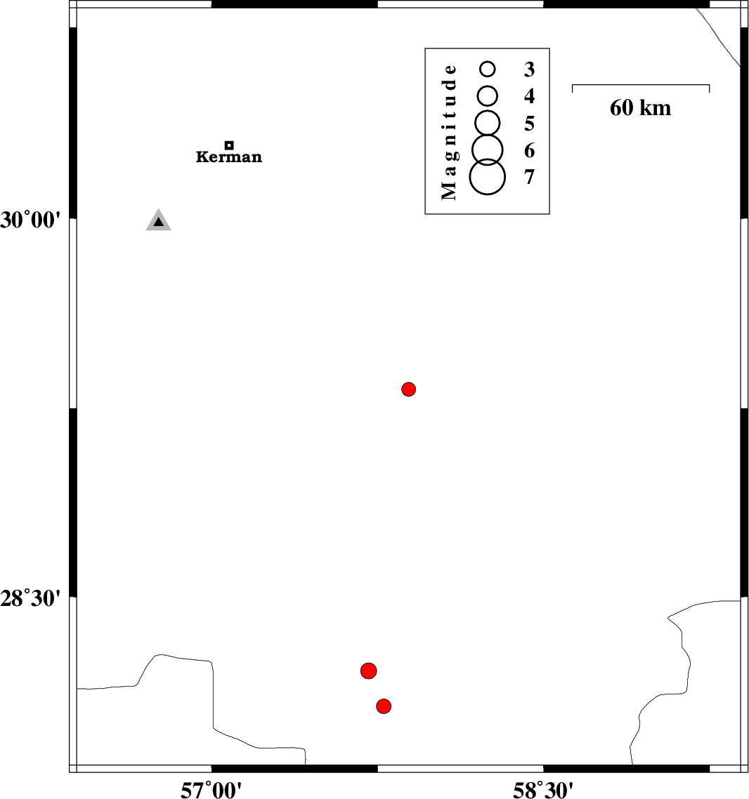 | 2017/05/26 | 06:33:51.6 | 11:03:51.6 | 28.203 | 57.709 | 14 | ML:3.3 | Kerman Province, 28 km North of Kahnuj |