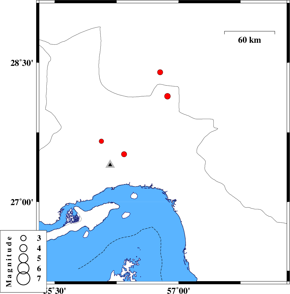 | 2017/08/01 | 06:58:10.3 | 11:28:10.3 | 27.775 | 56.536 | 21 | ML:2.6 | Hormozgan Province, 70 km North-East of Bandar-e abbas |
