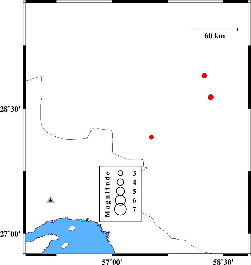 | 2017/08/04 | 19:42:56.1 | 00:12:56.1 | 28.514 | 57.247 | 14 | ML:3 | Kerman Province, 51 km South-West of Jiroft | ||