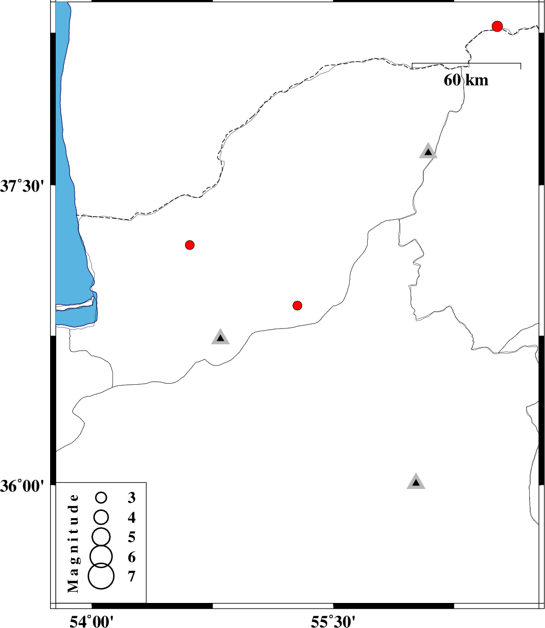 | 2017/08/07 | 19:29:42.0 | 23:59:42.0 | 37.203 | 54.608 | 15 | ML:2.5 | Golestan Province, 25 km North-East of Aq Qaleh | ||