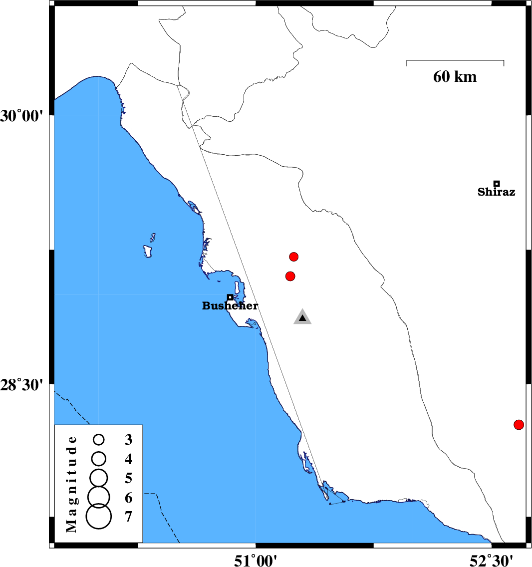 | 2017/08/19 | 11:32:42.4 | 16:02:42.4 | 29.103 | 51.219 | 15 | ML:2.7 | Bushehr Province, 18 km South of Borazjan | ||