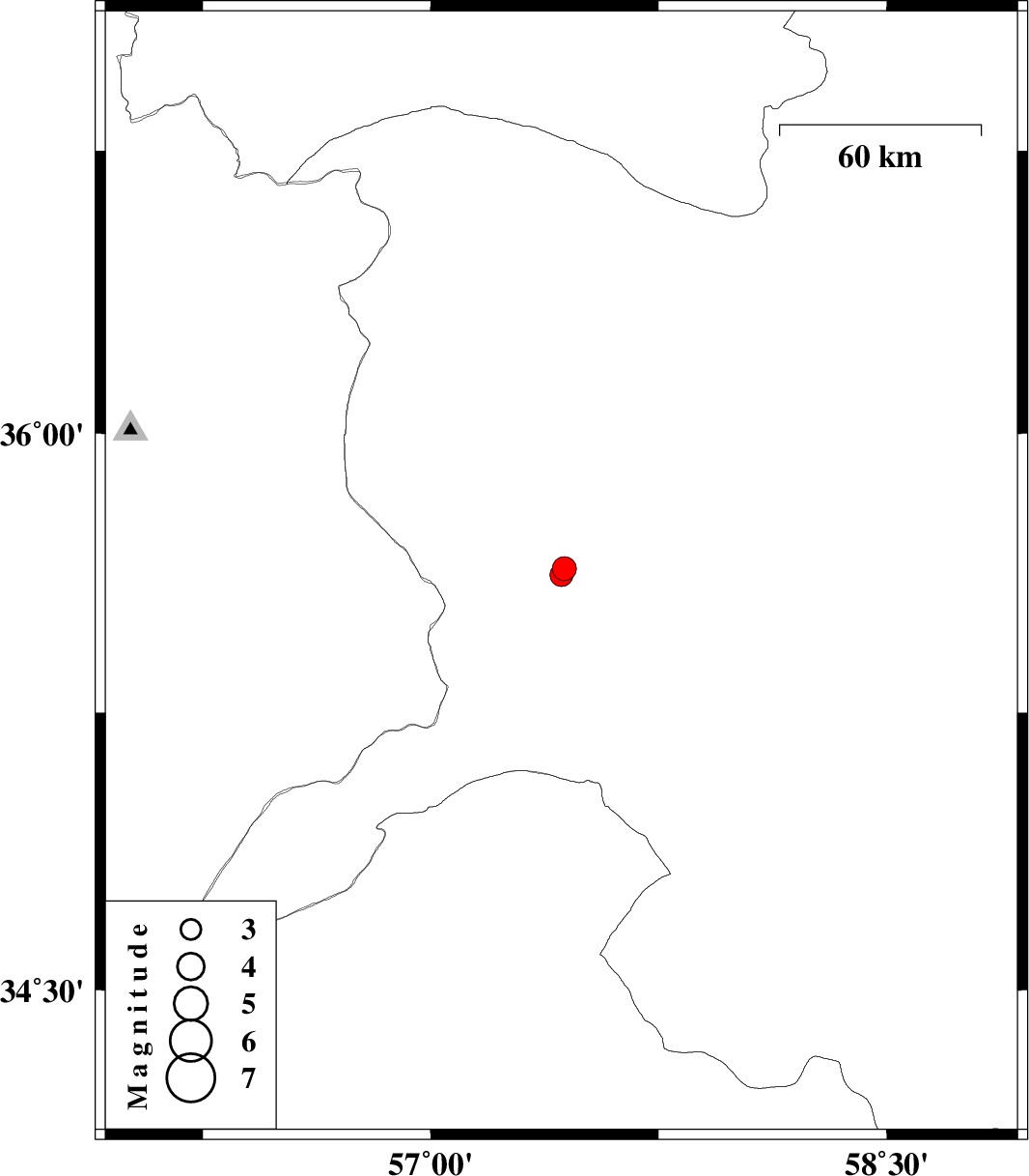 | 2017/08/23 | 06:09:43.5 | 10:39:43.5 | 35.62 | 57.43 | 14 | ML:3.4 | Khorasan(center) Province, 69 km South-West of Sabzevar |