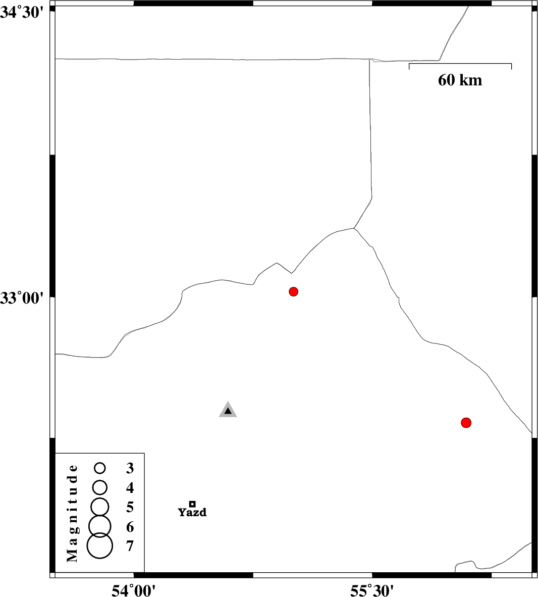 | 2017/08/01 | 00:02:56.8 | 04:32:56.8 | 32.331 | 56.09 | 14 | ML:2.8 | Yazd Province, 104 km North-East of Bafq |