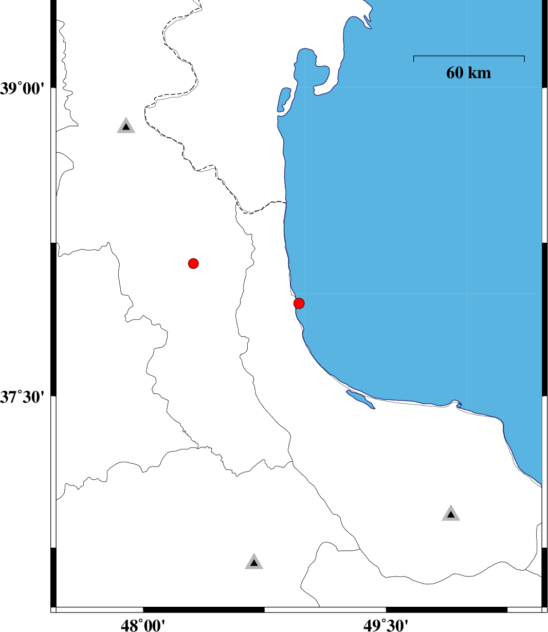 | 2017/08/23 | 07:07:34.7 | 11:37:34.7 | 37.954 | 48.962 | 16 | ML:3 | Caspian Sea, 18 km North of Hashtpar | ||