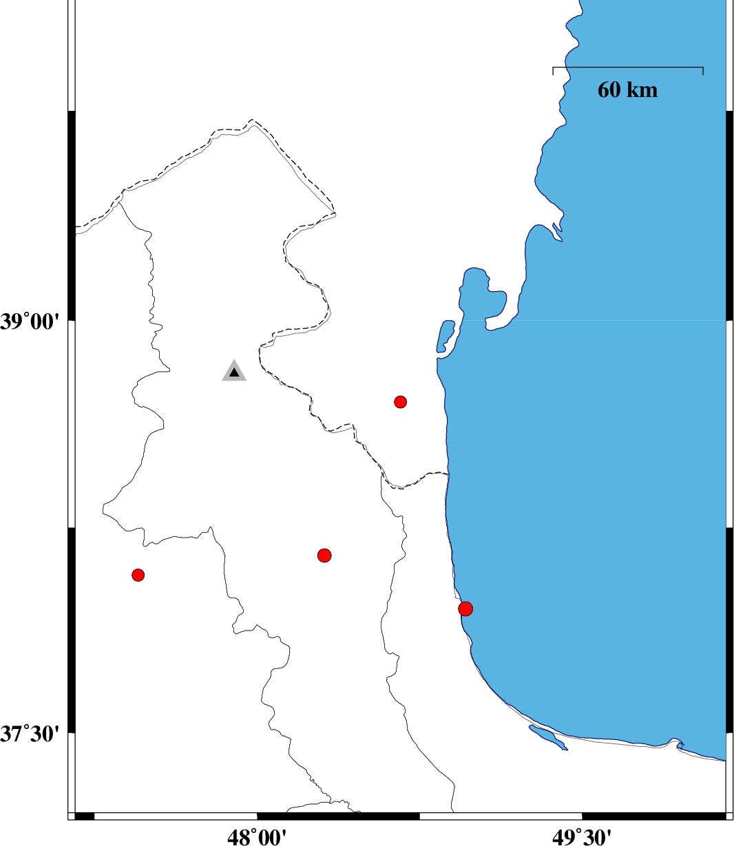 | 2017/08/23 | 07:07:34.7 | 11:37:34.7 | 37.954 | 48.962 | 16 | ML:3 | Caspian Sea, 18 km North of Hashtpar | ||