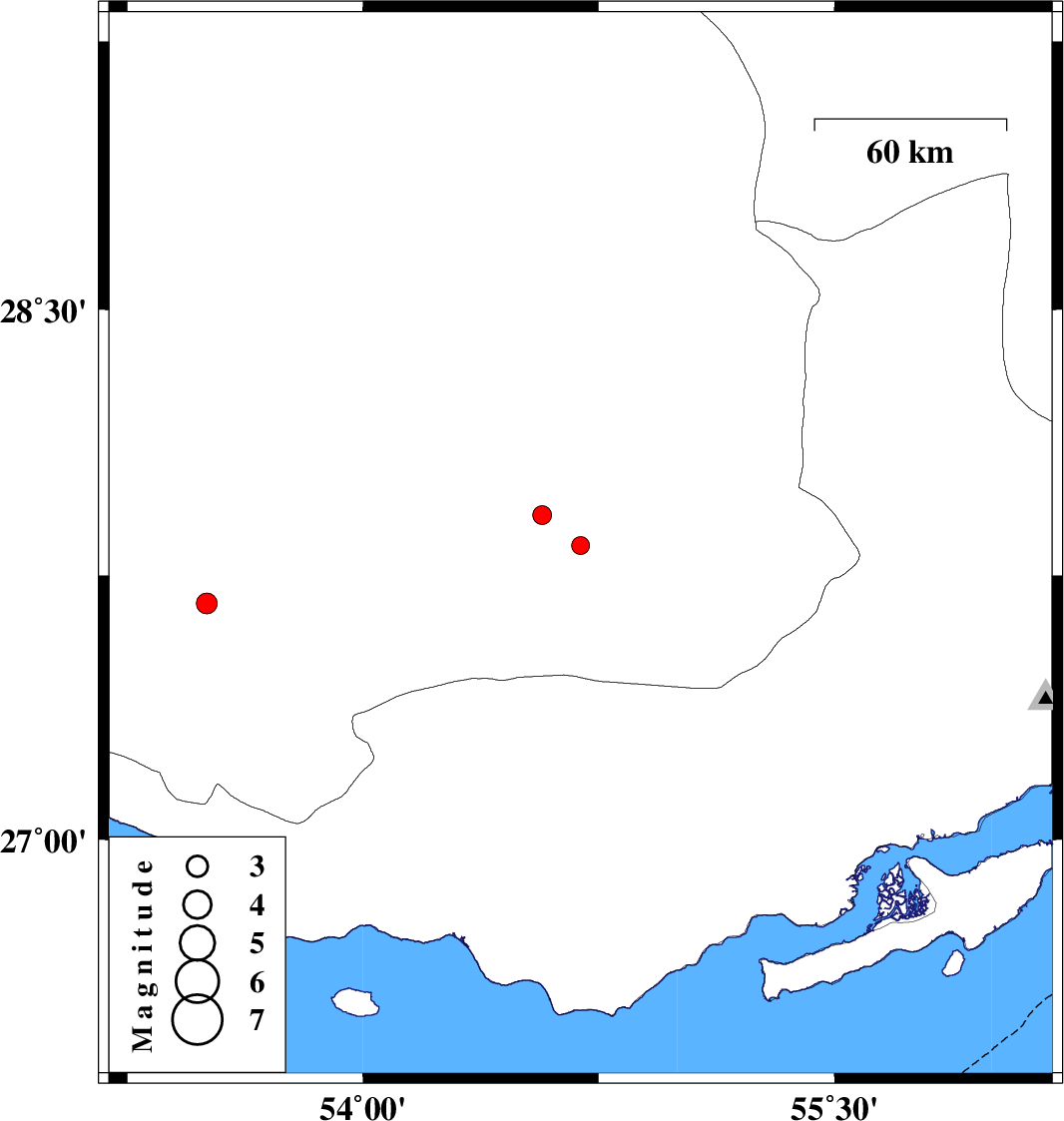| 2017/08/29 | 17:19:11.4 | 21:49:11.4 | 27.921 | 54.57 | 18 | ML:2.7 | Fars Province, 35 km North-East of Lar |