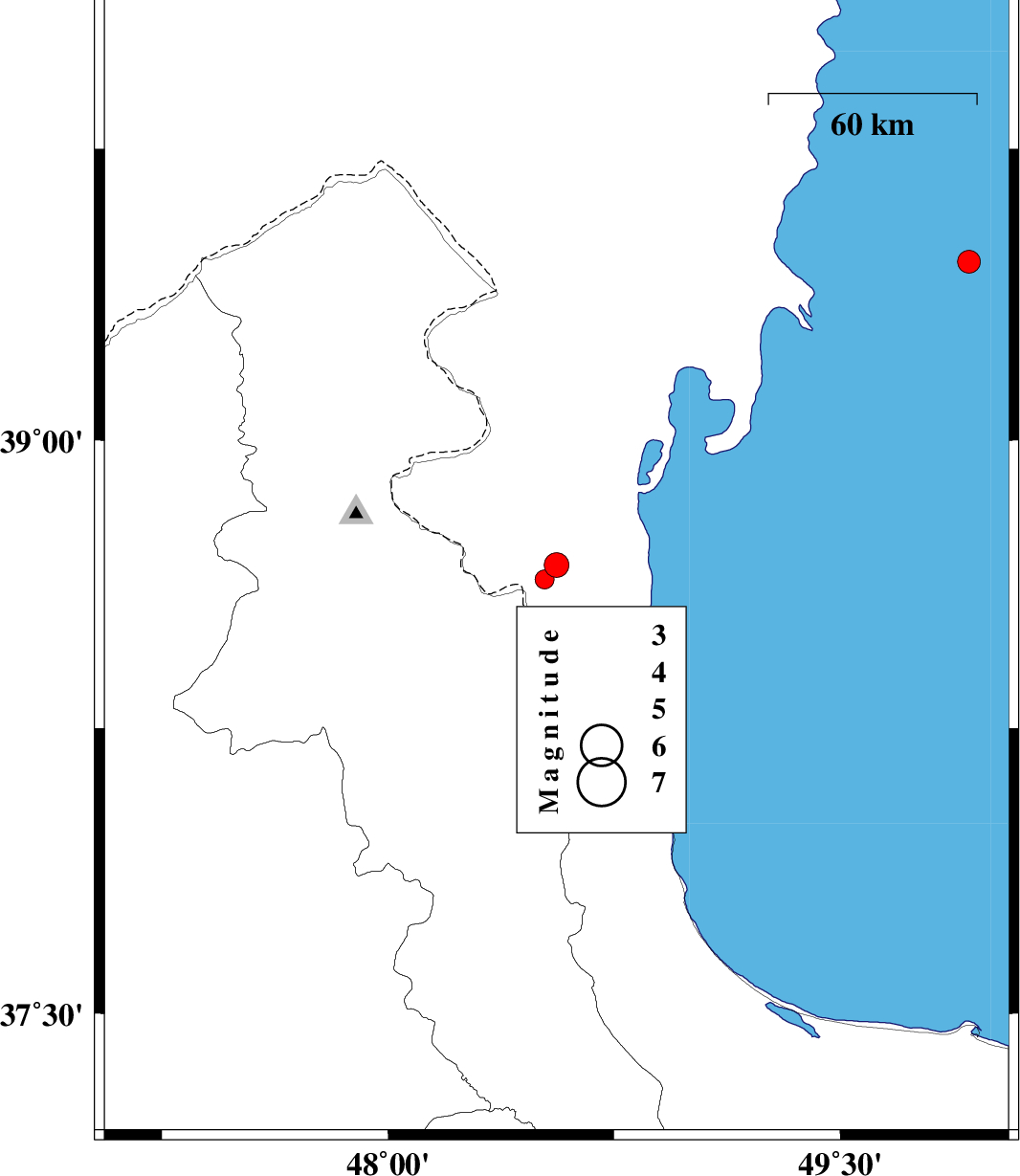 | 2017/09/10 | 02:32:23.0 | 07:02:23.0 | 38.692 | 48.559 | 31 | ML:3.4 | Azerbaijan, 30 km North-East of Namin | ||