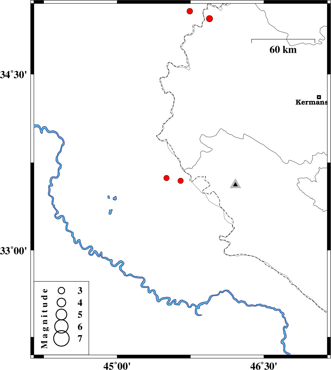 | 2017/09/17 | 02:13:33.0 | 06:43:33.0 | 33.595 | 45.649 | 14 | ML:2.6 | Iraq, 66 km South-West of Gilan-E-Gharb | ||