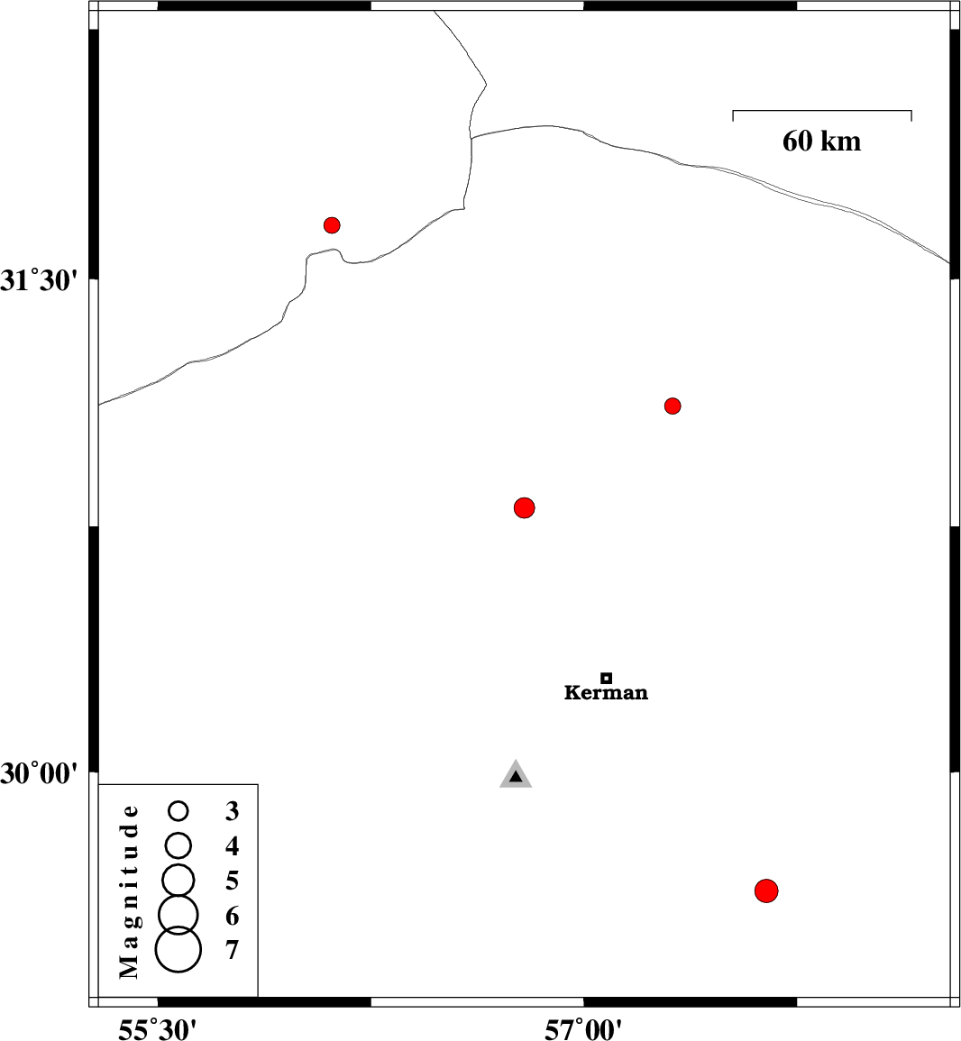 | 2017/03/18 | 18:33:04.4 | 22:03:04.4 | 31.116 | 57.313 | 14 | ML:2.5 | Kerman Province, 50 km South-East of Ravar | ||