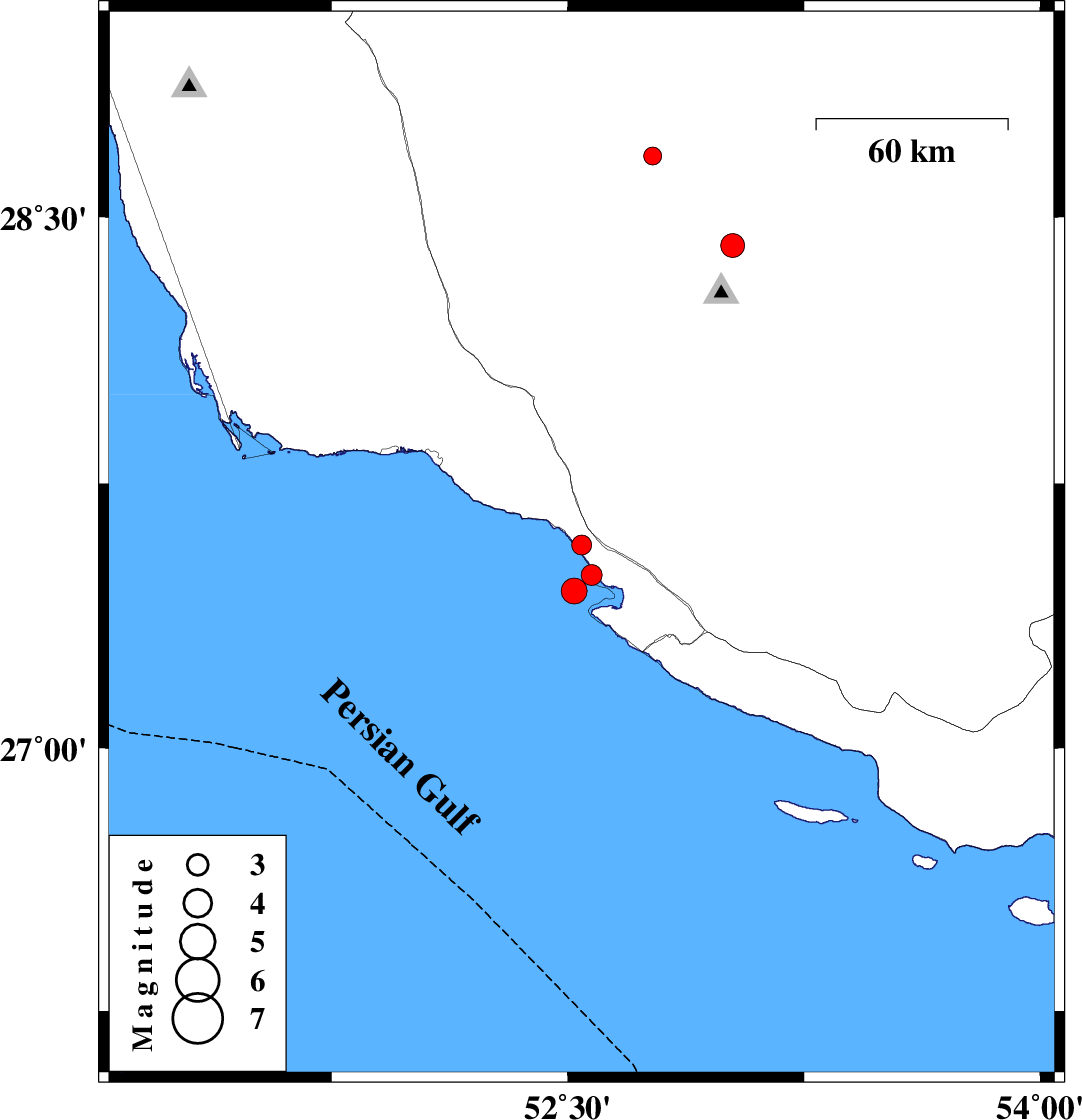 | 2017/10/14 | 18:11:51.3 | 21:41:51.3 | 27.491 | 52.576 | 15 | ML:2.9 | Persian Gulf, 31 km -West of Mehr | ||