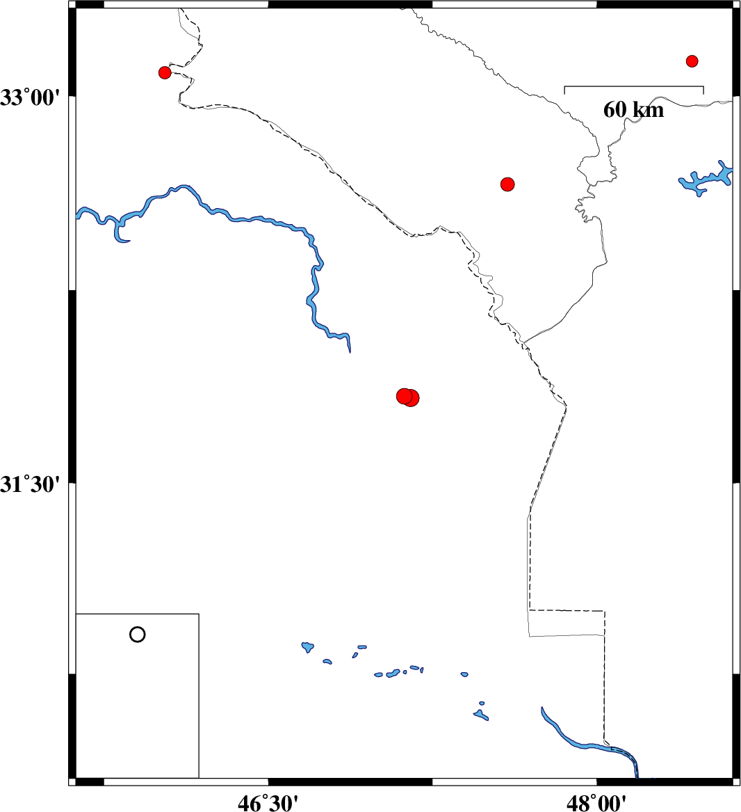 | 2017/10/20 | 02:19:40.9 | 05:49:40.9 | 31.838 | 47.121 | 15 | ML:3.2 | Iraq, 96 km South-West of Dehloran | ||