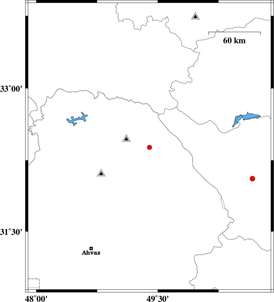 | 2017/10/25 | 09:06:05.9 | 12:36:05.9 | 32.385 | 49.398 | 14 | ML:2.6 | Khoozestan Province, 27 km -East of Lali | ||