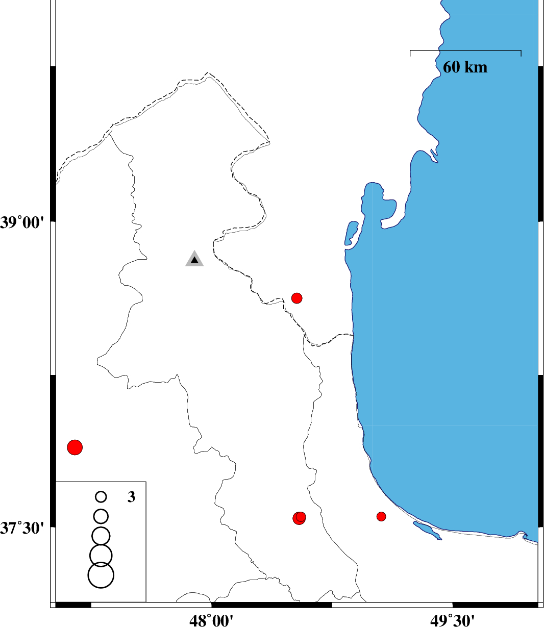| 2017/10/27 | 18:06:59.6 | 21:36:59.6 | 38.626 | 48.53 | 11 | ML:2.9 | Azerbaijan, 22 km North of Namin | ||